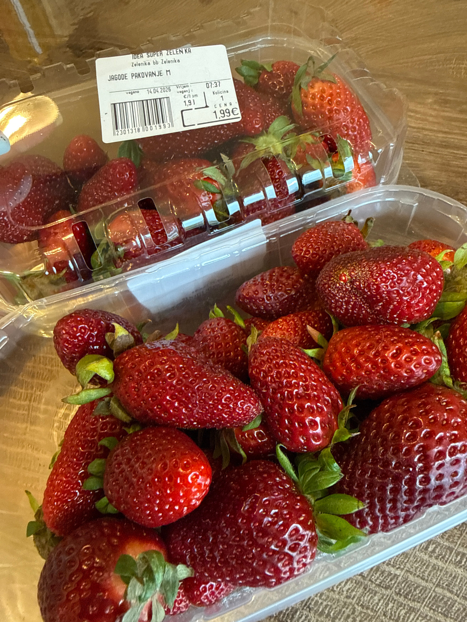 The image shows two transparent plastic containers filled with strawberries. A label on one of the containers indicates the strawberries are "JAGODE PAKOVANJE M" (packaged strawberries M) from "IDEA S…read more