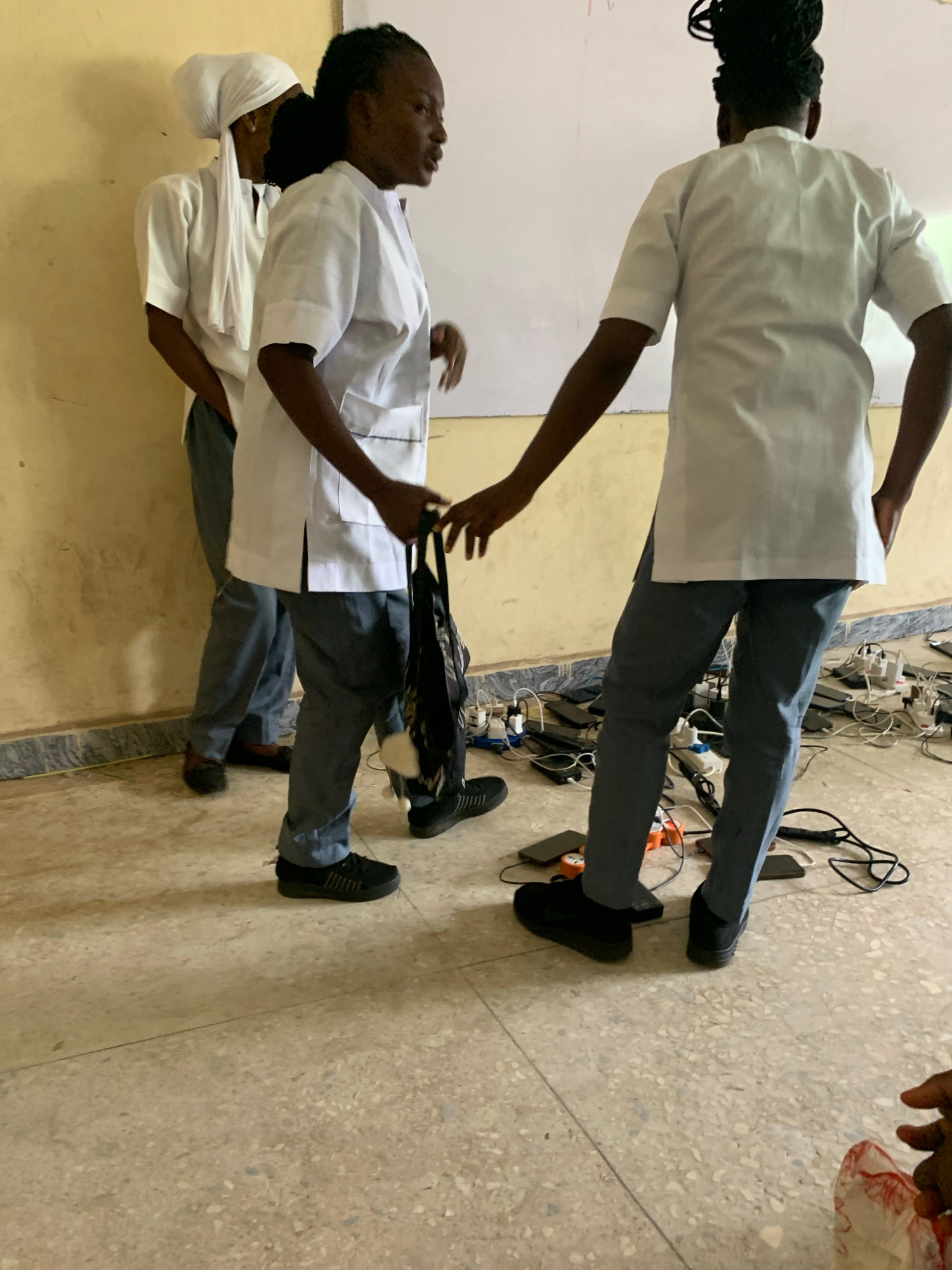 Two individuals wearing white tops and grey pants are in a room with a light-colored tiled floor. One person is standing facing away from the camera, while the other person is also standing with their…read more