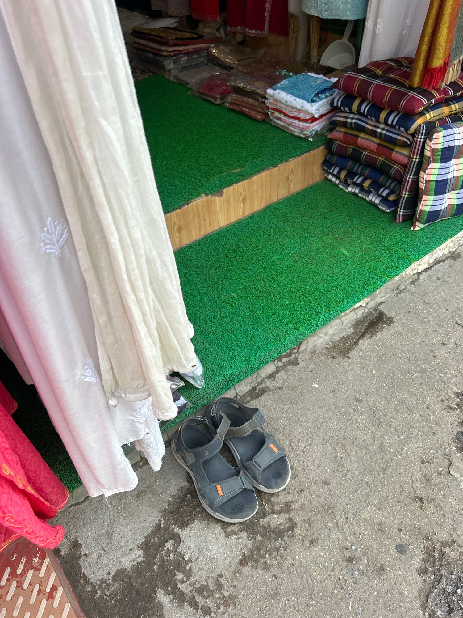 A high-angle shot captures a scene on a sidewalk in Puttaparthi, India, where various fabrics and sandals are placed. The left side of the frame features stacked fabrics in a variety of colors and pat…read more