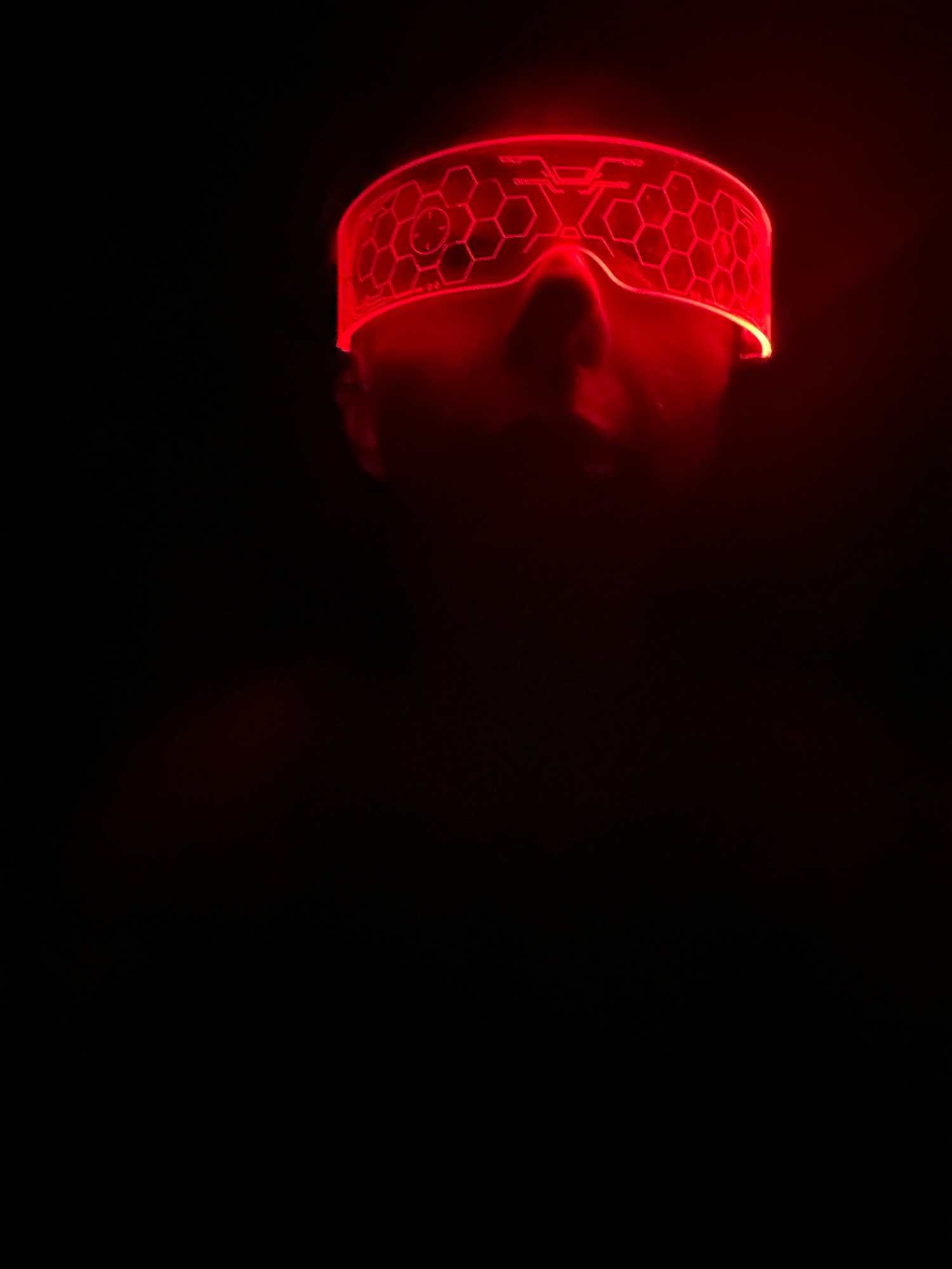 The image displays a close-up of a person's head in a profoundly dark environment, likely an indoor setting at night in Votkinsk, Russia. The central subject is a glowing red headband or visor worn ac…read more