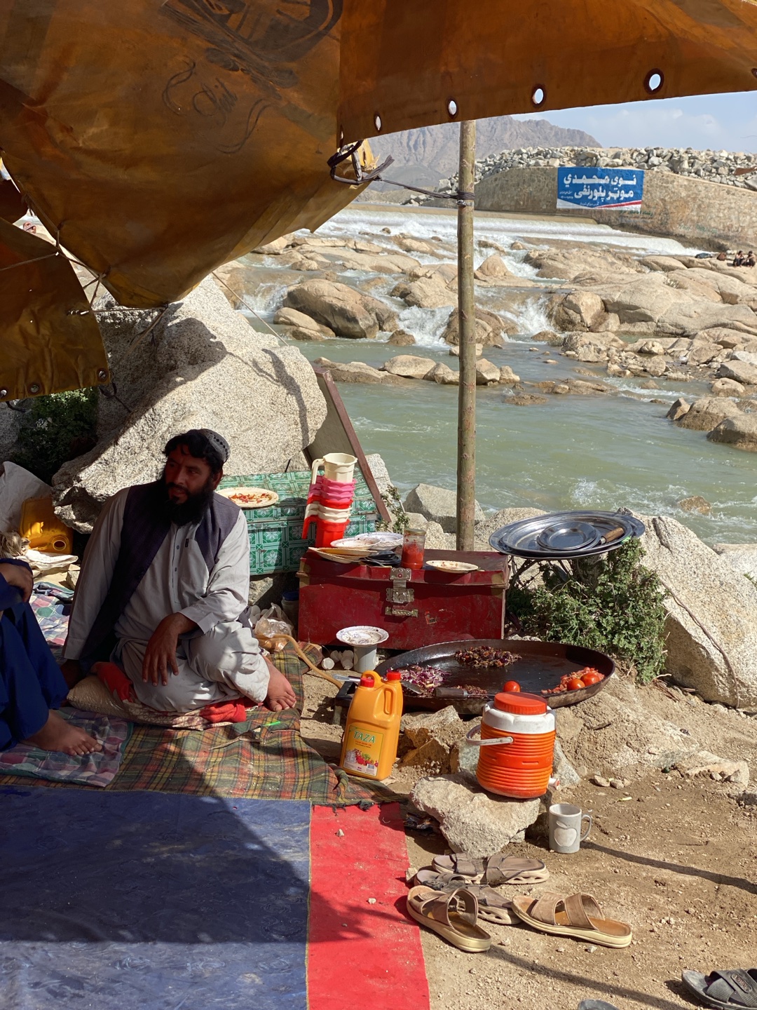 A man wearing a light gray shalwar kameez and a black turban sits cross-legged on a colorful blanket under a large, tan-colored umbrella. He has a beard and is looking towards the left of the image. N…read more