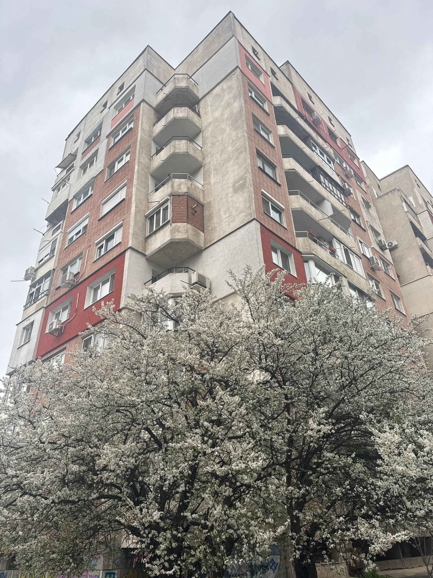 An upward-angled shot reveals a high-rise apartment building adjacent to a tree in full bloom, likely located in Sofia, Bulgaria. The building features a concrete structure with alternating sections o…read more