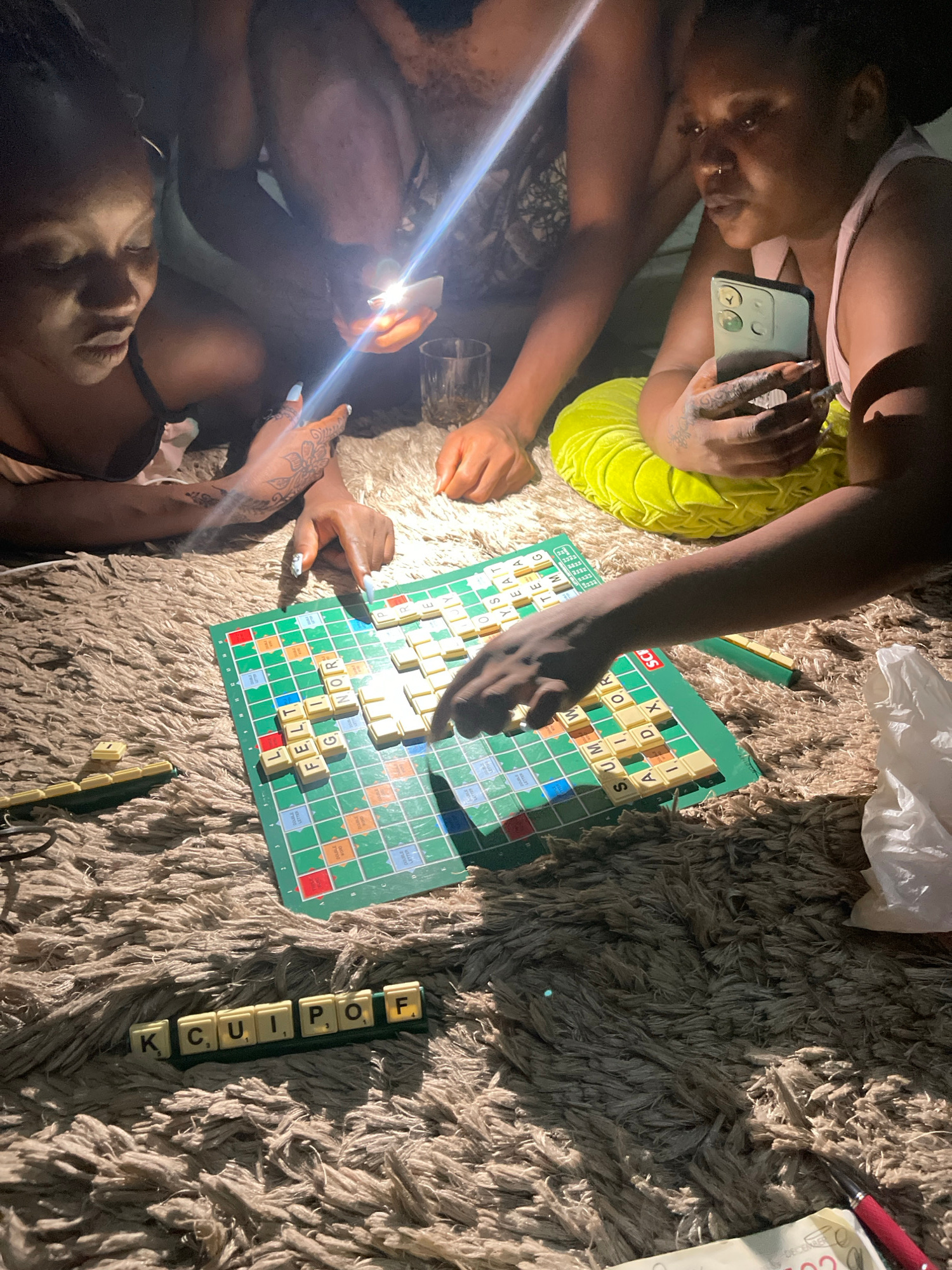 This media file captures an intimate, dimly lit indoor scene in Kuchingoro, Nigeria, where two individuals are playing Scrabble on a shaggy, light-brown rug. The overall impression is one of a casual…read more