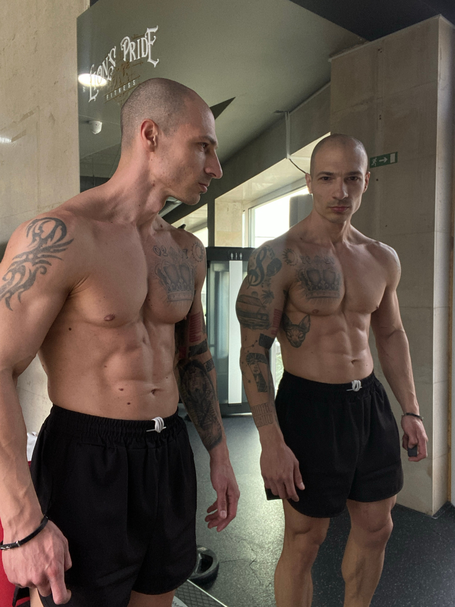 A muscular, bald man with tattoos on his upper body is standing in front of a reflective surface. He is wearing black shorts. His reflection is visible in the surface, creating a mirror image of him.…read more