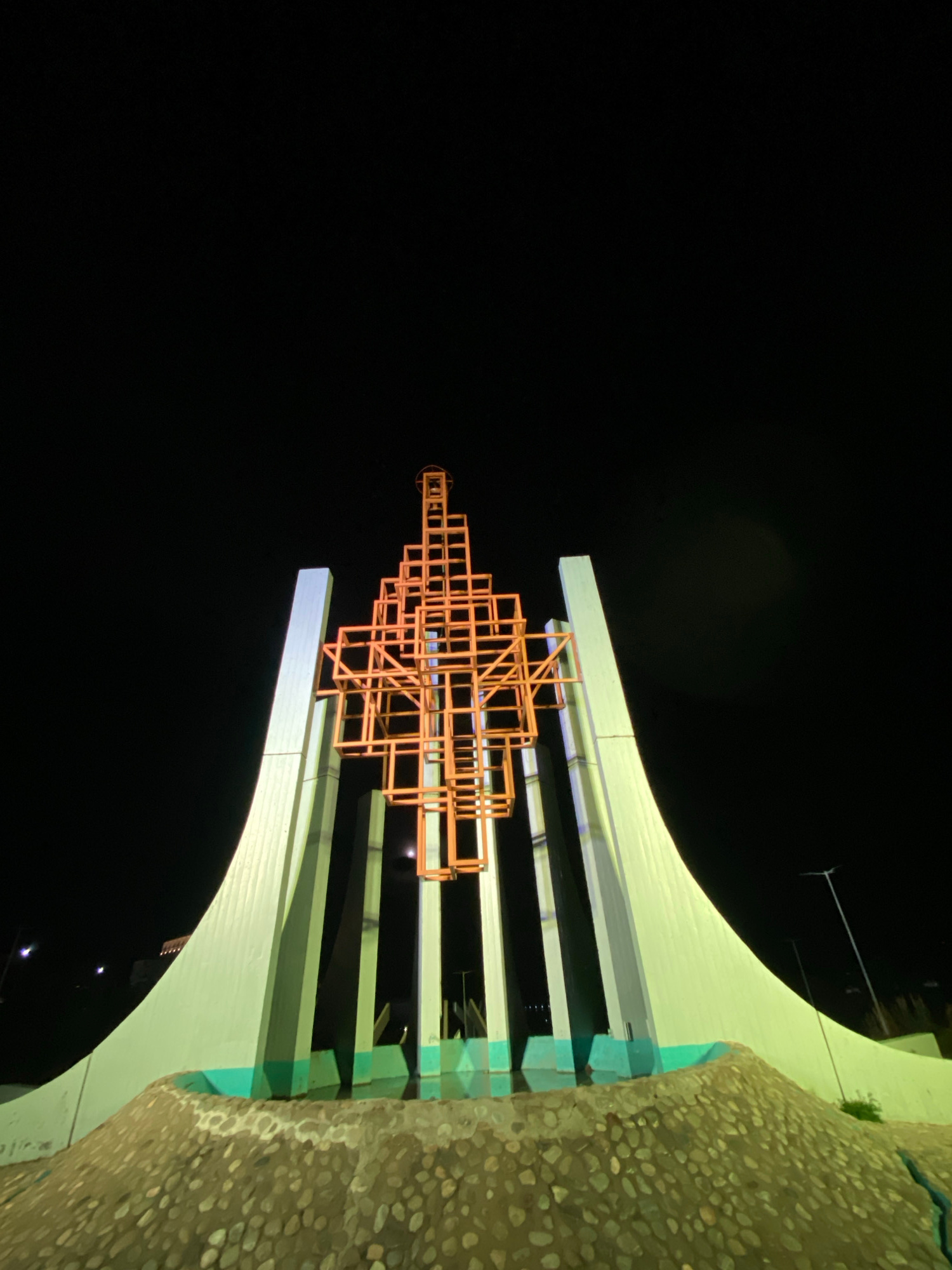 The image depicts an architectural structure in Ushuaia, Argentina, captured at night. The structure features a series of interconnected orange metal frameworks arranged in a geometric pattern. These…read more