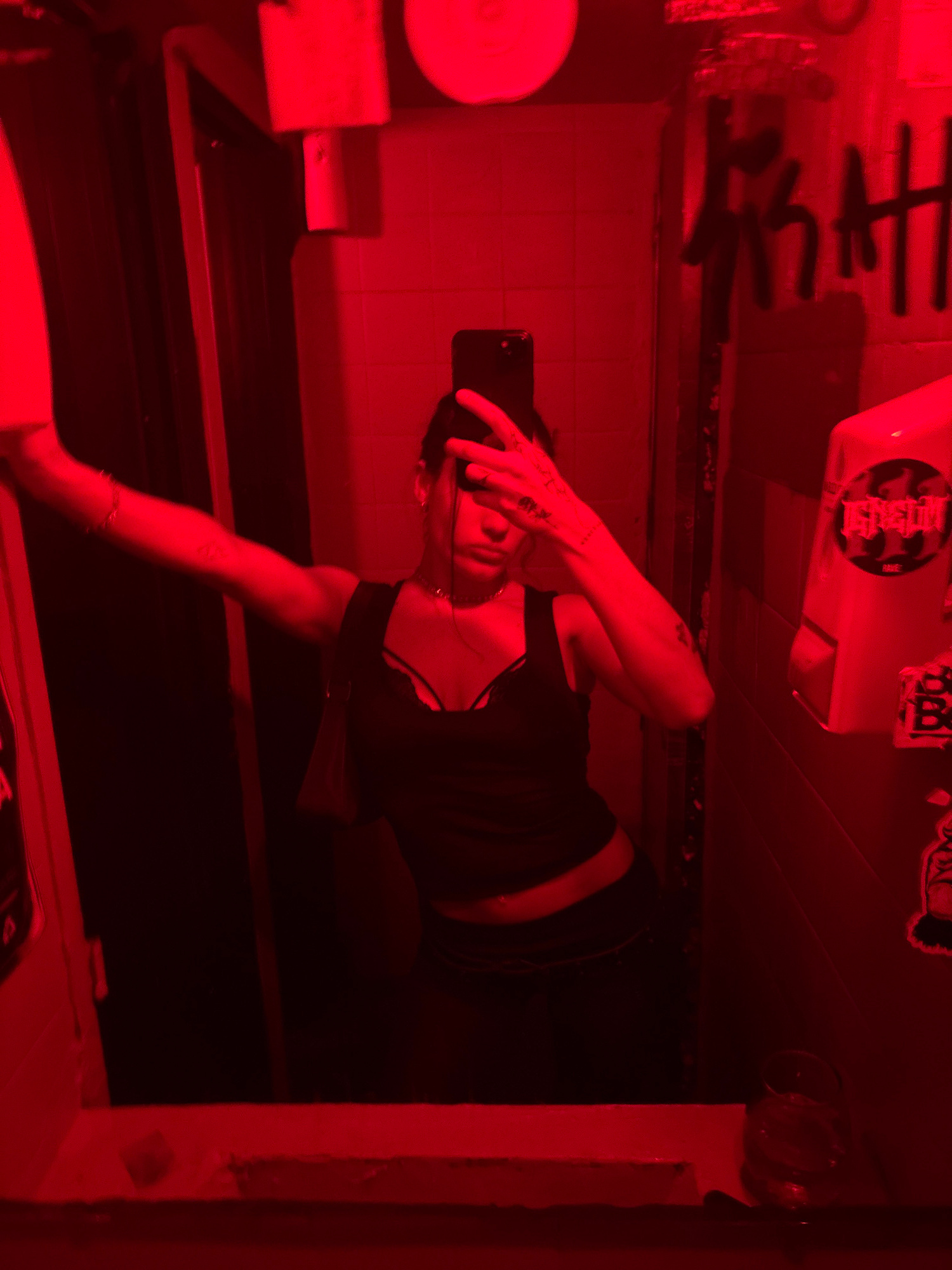 The image shows a person taking a selfie in a bathroom mirror. The bathroom is dimly lit with a red light. Graffiti is visible on the wall above the sink. A hand dryer is mounted above the sink. There…read more