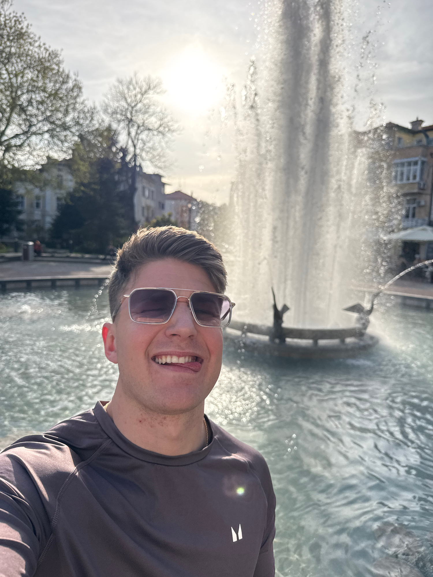 A man is taking a selfie in front of the Plovdiv Singing Fountains in Bulgaria. The fountain is active, spraying water high into the air. The man is wearing sunglasses and a gray shirt and is smiling…read more