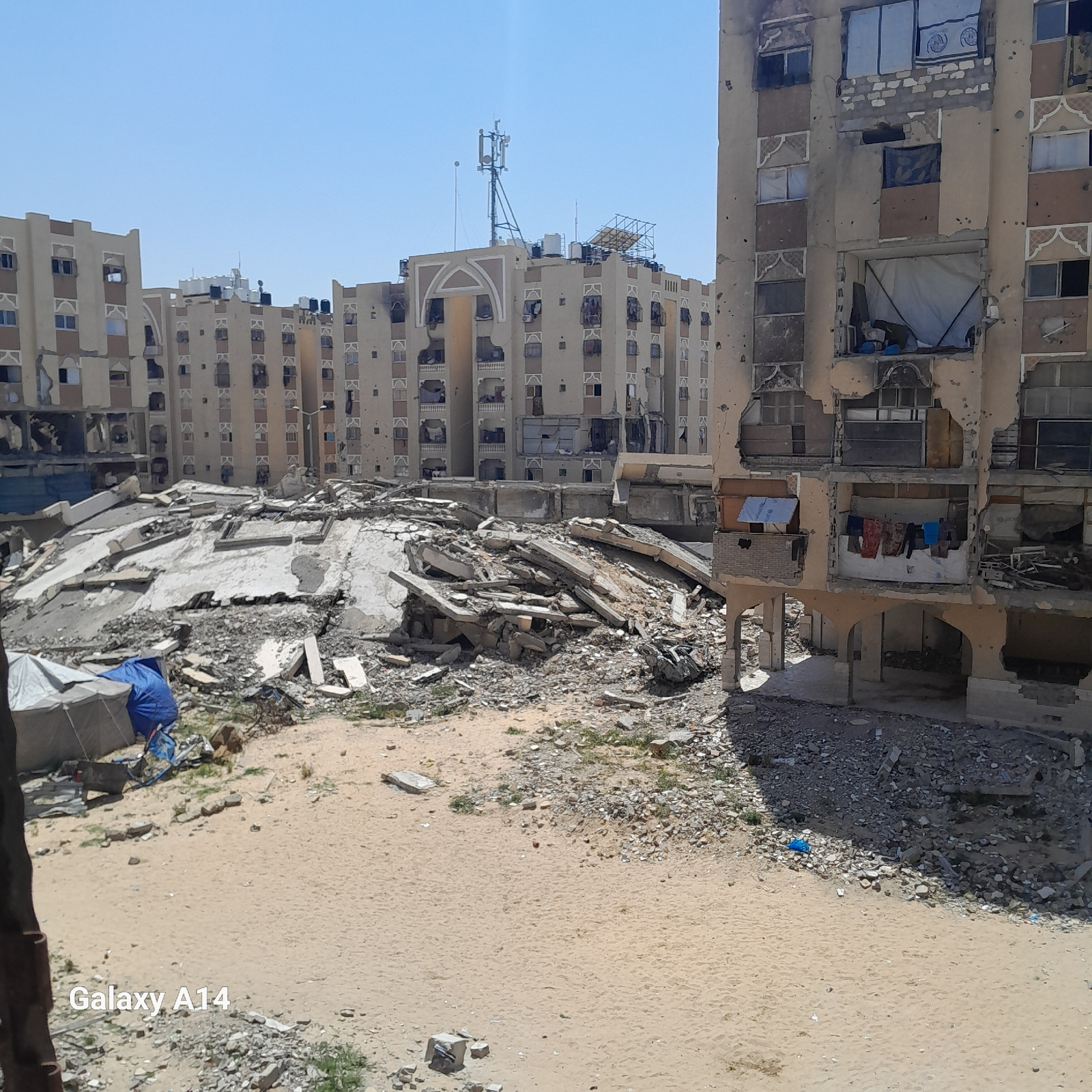 The image depicts extensive destruction, likely from military action or conflict, in what is reported as Khan Yunis, Palestinian Territory. An apartment building is heavily damaged, with multiple floo…read more