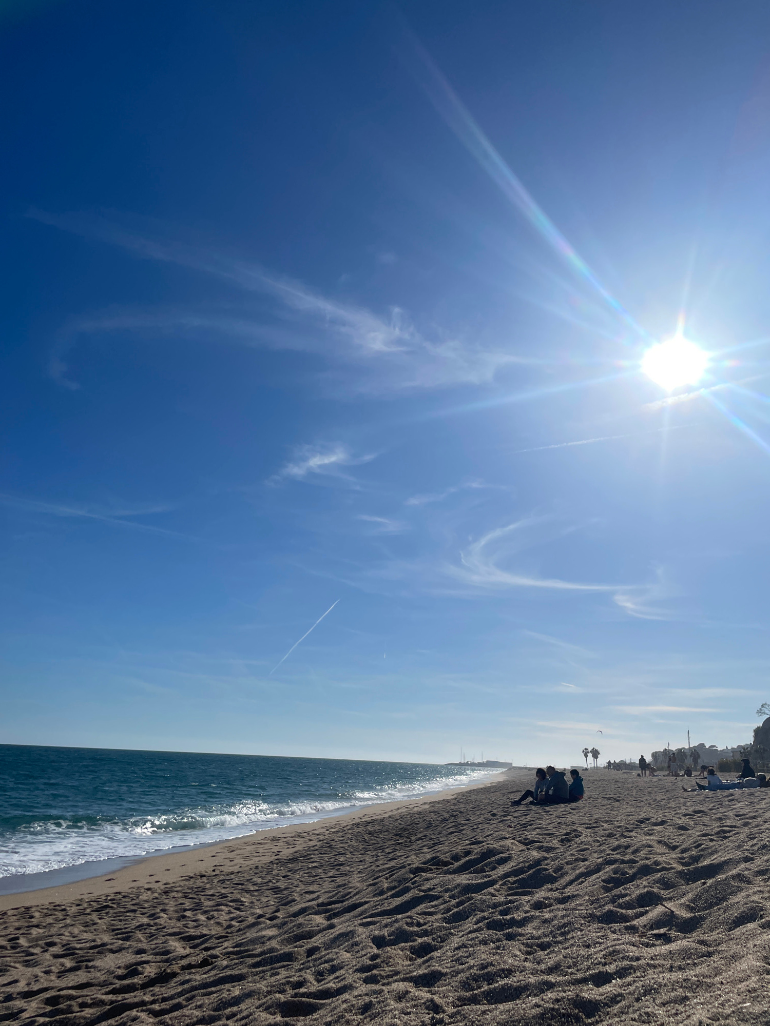 Here's a detailed description of the scene: The image captures a bright, sunny day at the beach in Canet De Mar, Spain. The sky is a vivid blue, with wispy cirrus clouds and a visible contrail from a…read more