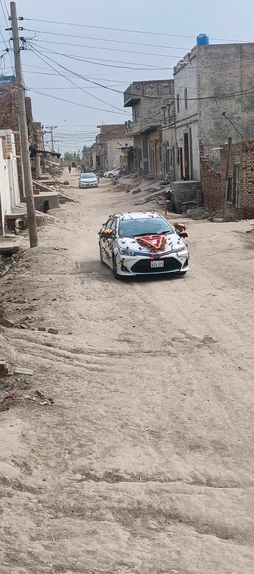 A white Toyota Corolla, prominently decorated with an abundance of red, orange, and yellow flowers, takes center stage as it drives down a dusty, unpaved road in Karamsar, Pakistan. The car's front liβ¦read more