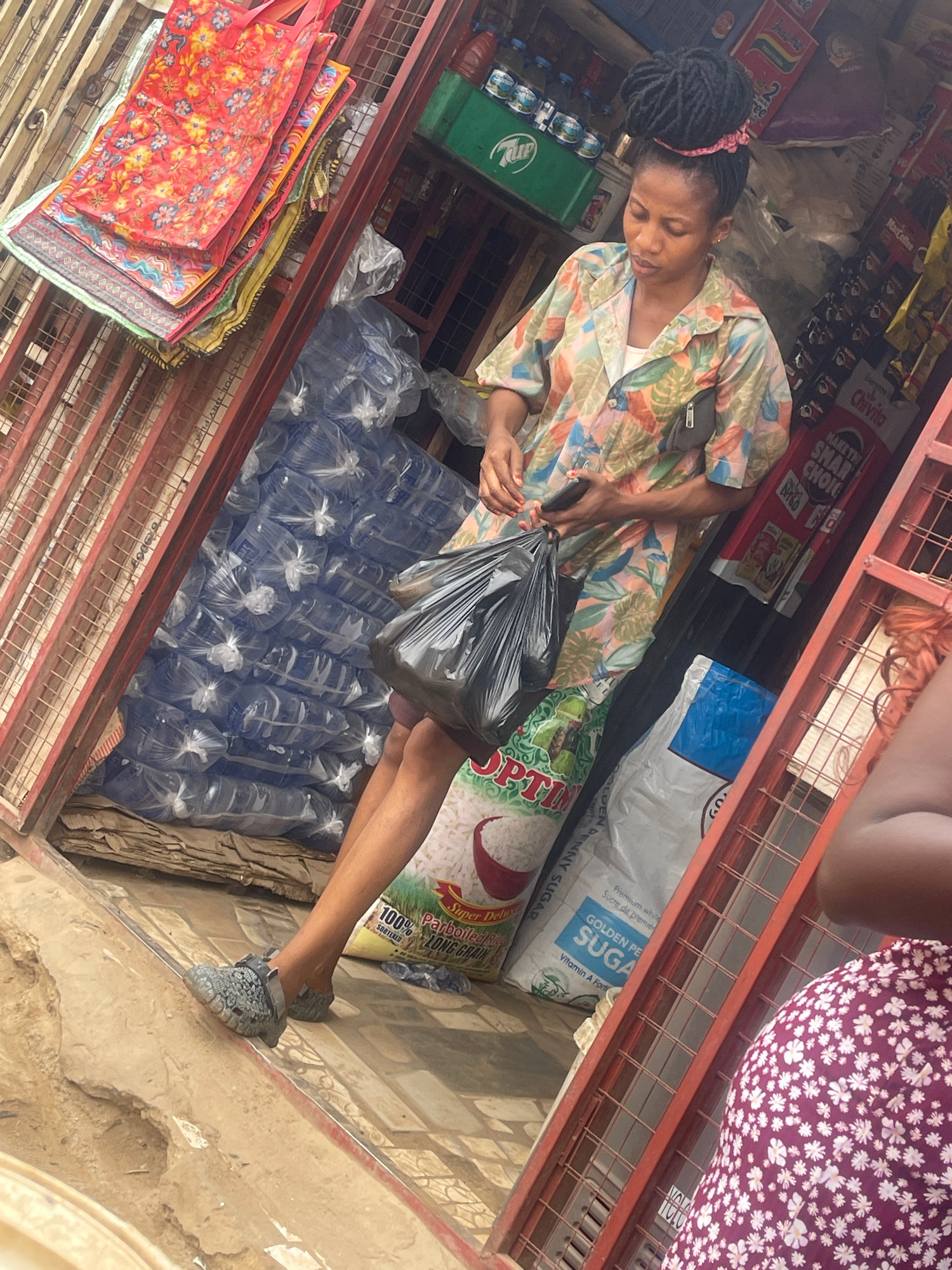 A woman with dark hair and a pink hairband stands inside a small shop in Abuja, Nigeria. She is wearing a patterned shirt with orange and green hues. She holds a black plastic bag. She is facing bags…read more