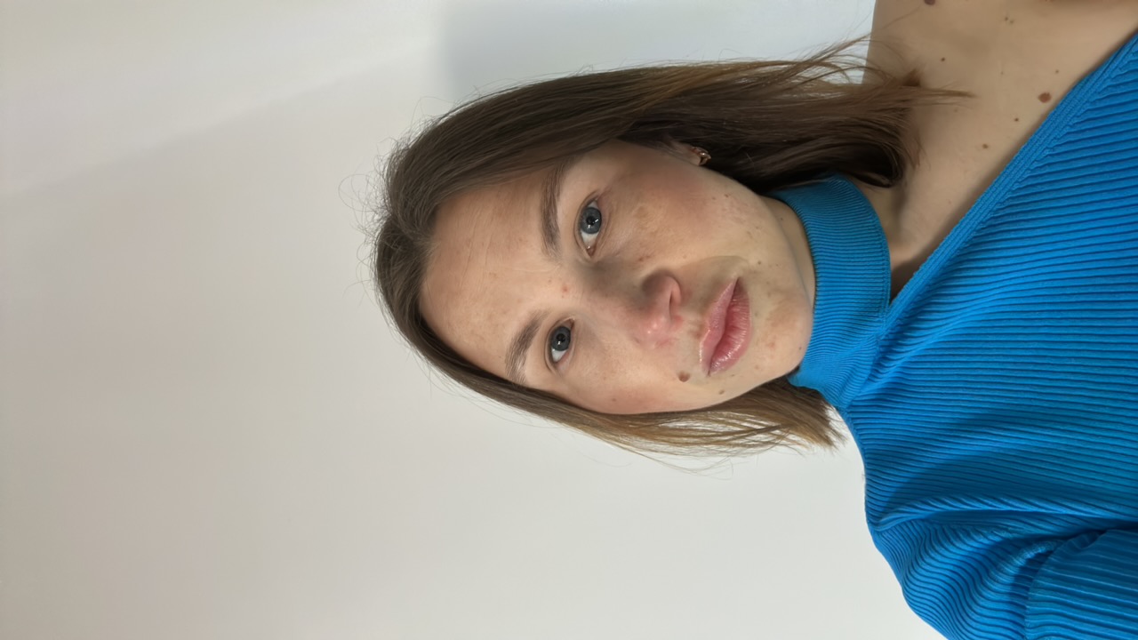 A young woman is depicted taking a mirror selfie indoors. The image is oriented sideways, showing her head tilted to the right. She has long brown hair and a neutral expression, gazing directly at the…read more