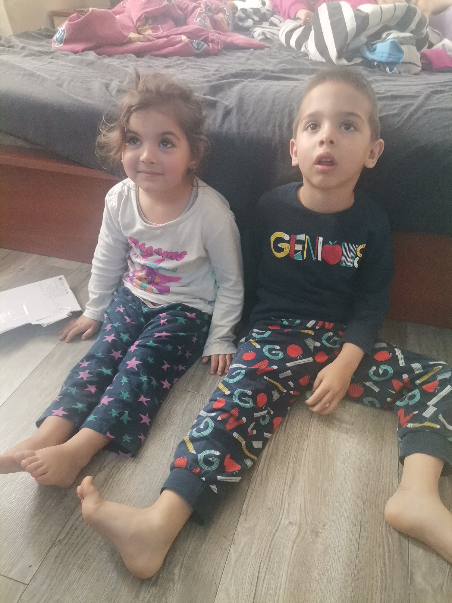Two barefoot children, a girl and a boy, are seated on a light-colored wood floor in front of a bed. The girl, on the left, wears a long-sleeved white shirt with a colorful graphic and blue and purple…read more