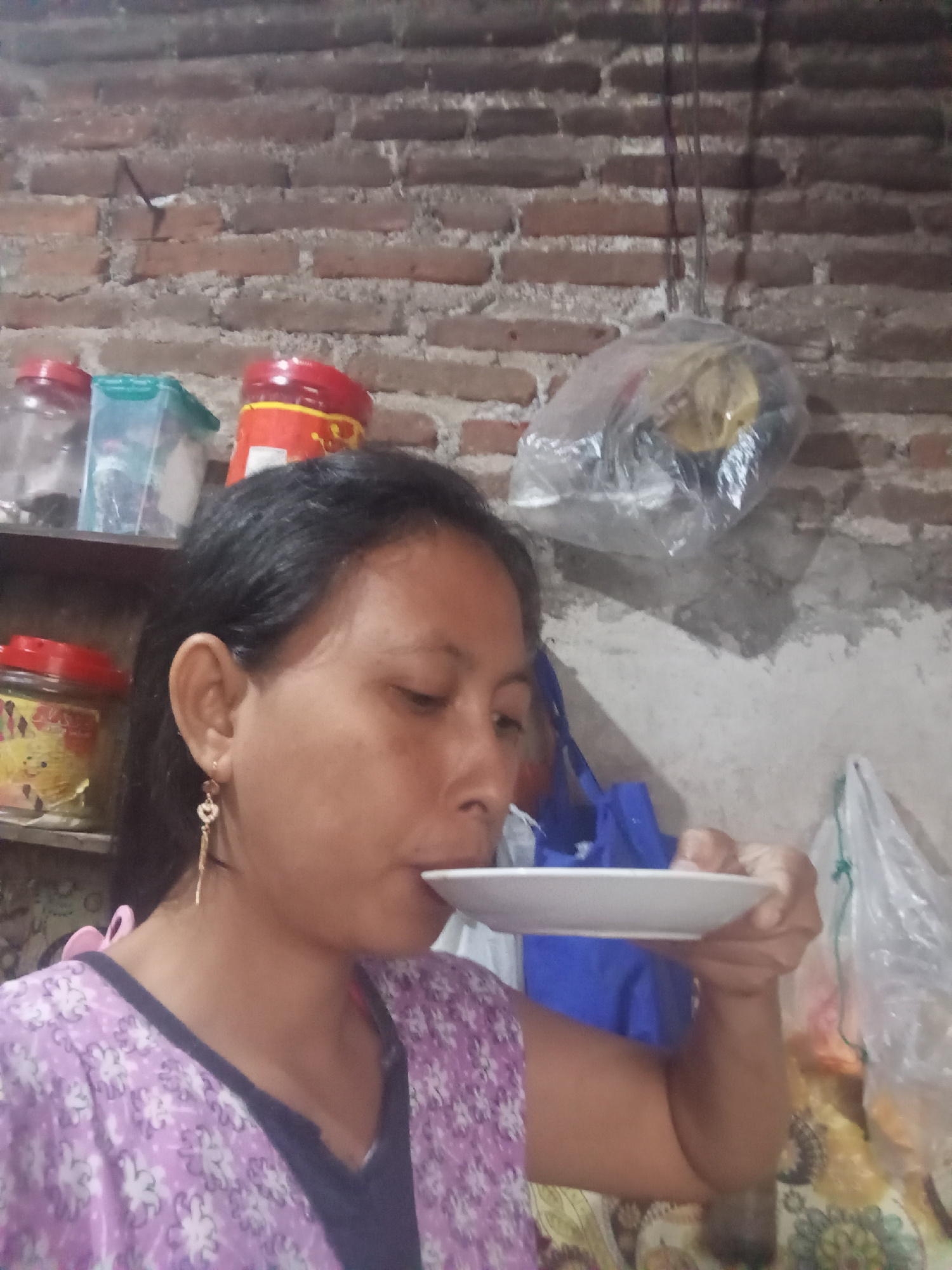An indoor, eye-level shot captures a person, likely an adult female with dark hair, angled towards the left side of the frame. She is wearing a purple top with a floral pattern and a dark undergarment…read more