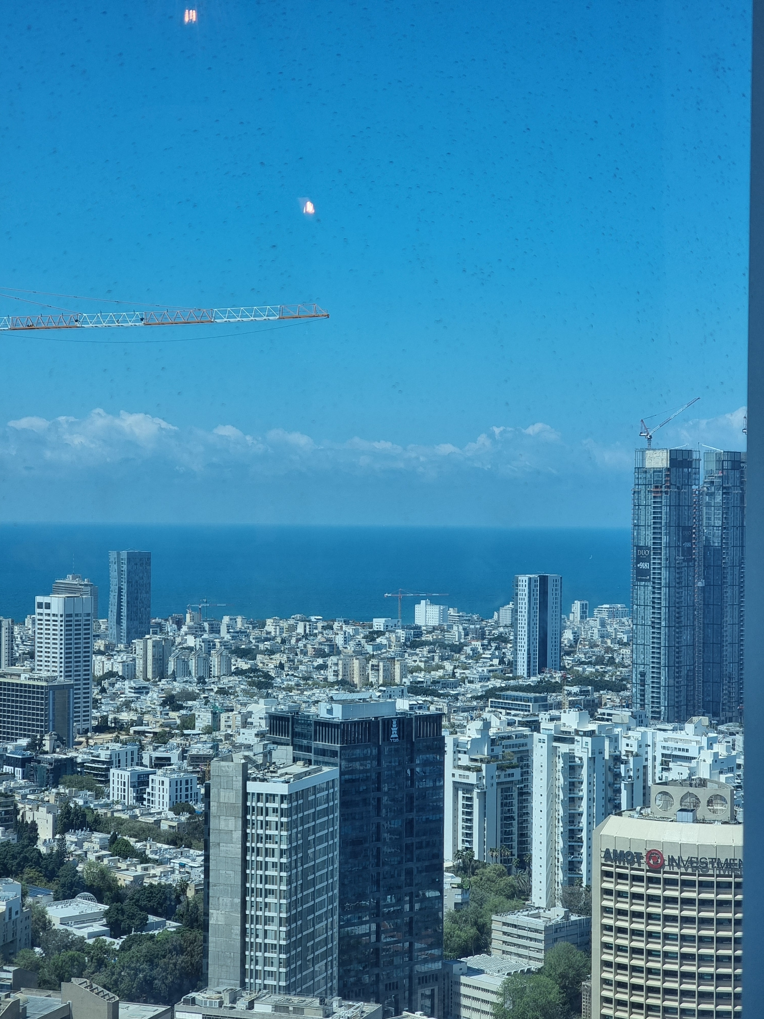 The image presents a high-angle, slightly blurry view of Tel Aviv, Israel, likely captured through a window. The left portion of the frame is dominated by a bright blue expanse representing the sky anβ¦read more