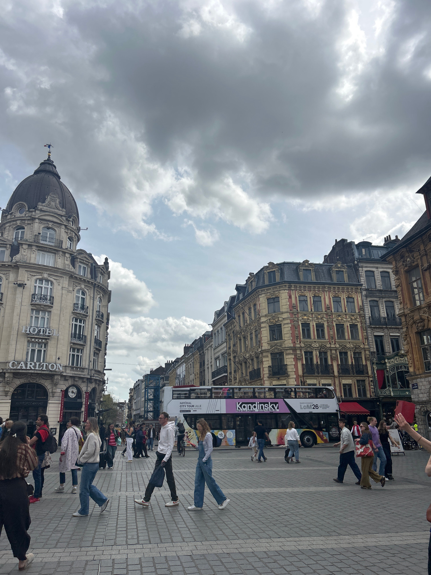 This daytime photograph captures a bustling street scene in Lille, France, under an overcast sky. The image features a wide paved pedestrian area flanked by ornate, multi-story European buildings. On…read more