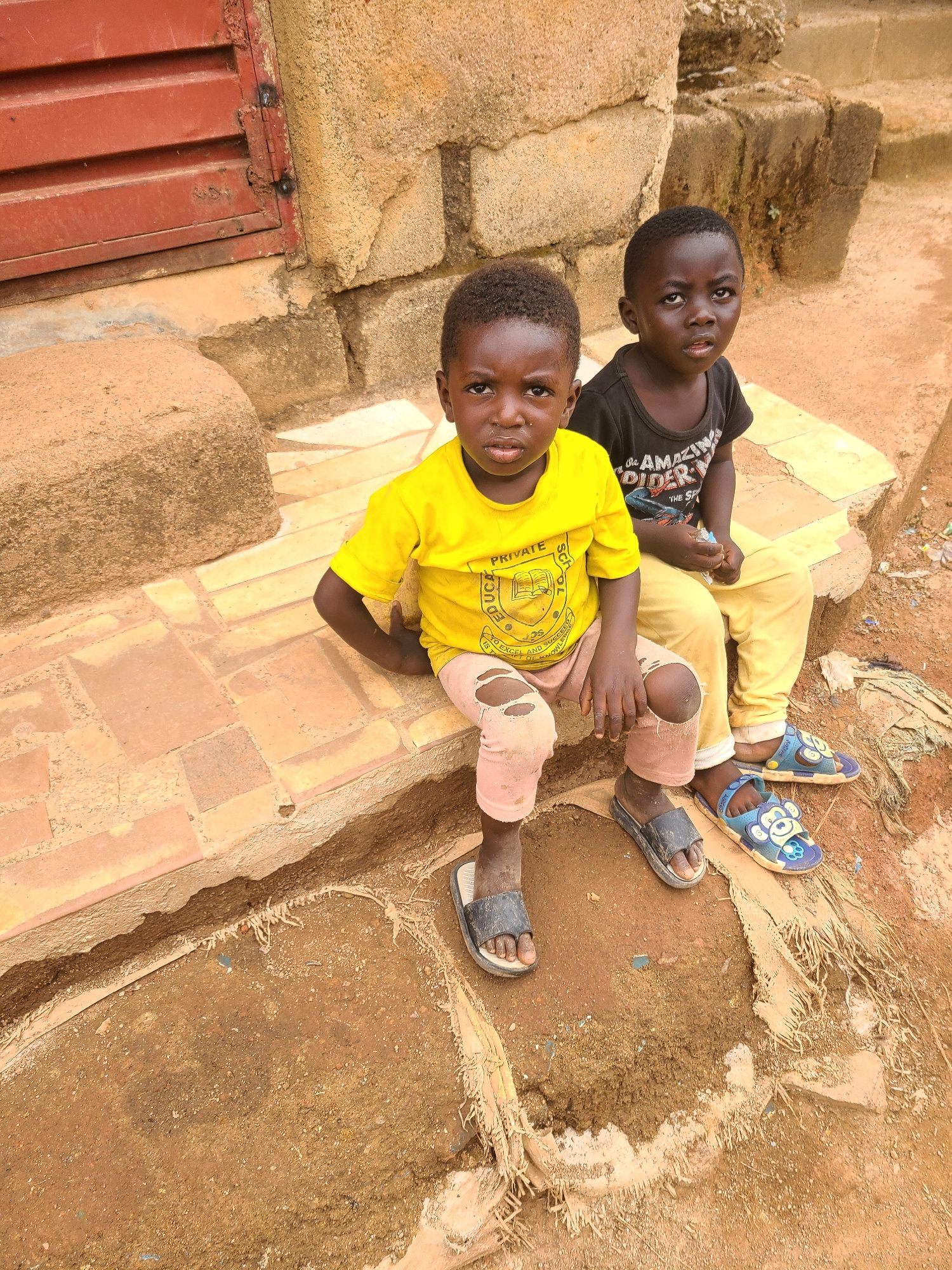 Two young children are seated on a raised brick and concrete surface outdoors on a bright, sunny day, consistent with the location context of Jos, Nigeria. Both children have dark skin and short, dark…read more