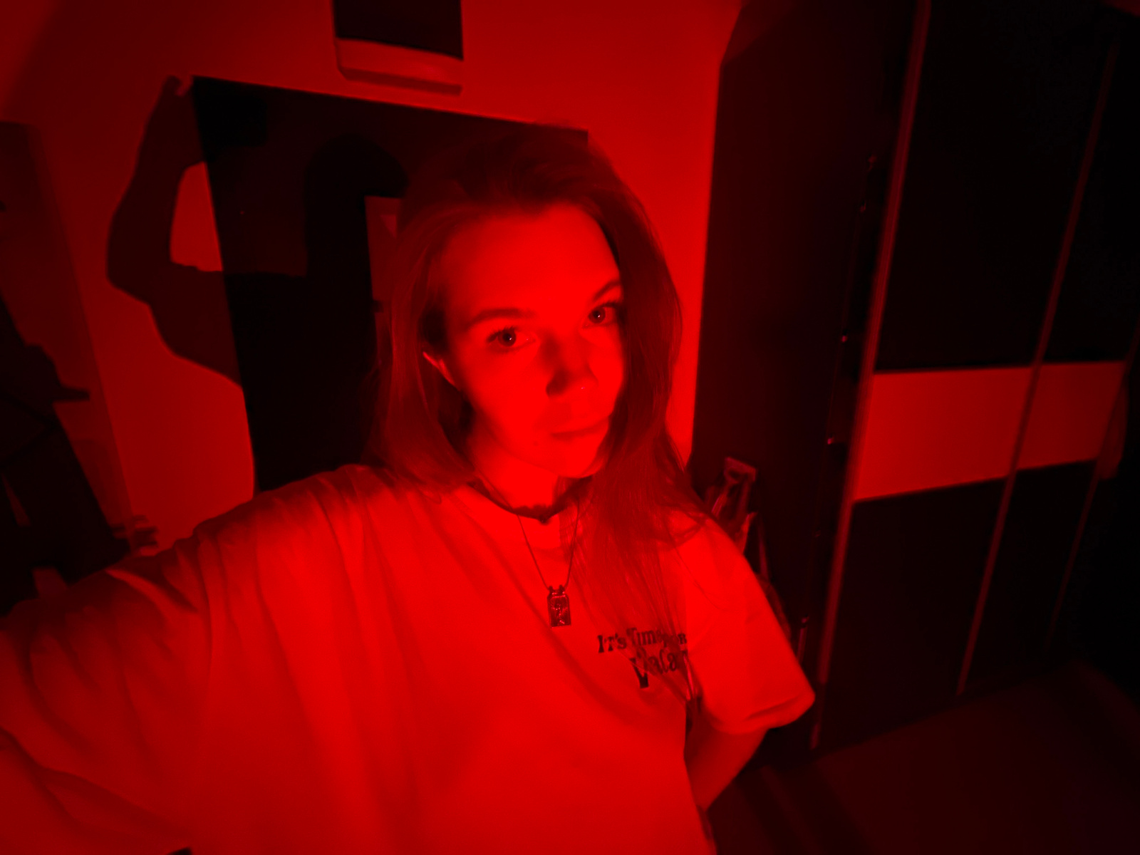 An inverted portrait shows a young woman looking directly at the camera, bathed in intense red light. Her head is positioned towards the bottom of the frame, with her body extending upwards (in the or…read more
