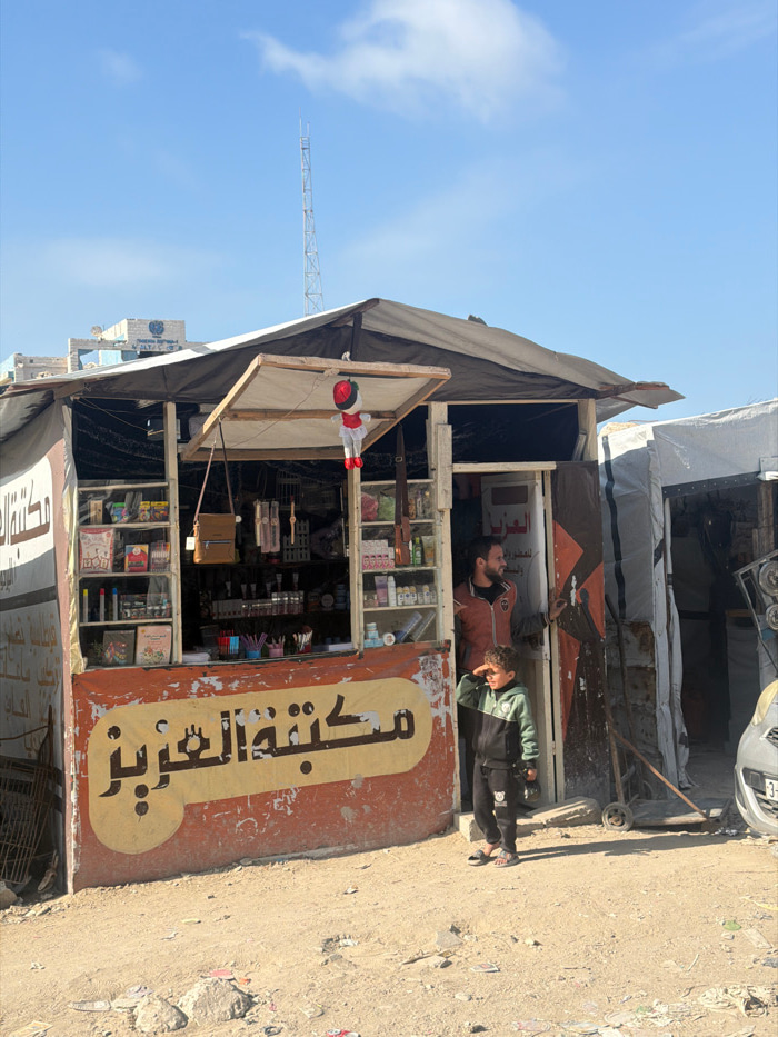 A small, weathered store with shelves stocked with goods sits beside a dusty road. The sign on the front, written in Arabic, is worn. Two men are relaxing near the store's entrance, one appears to be…read more