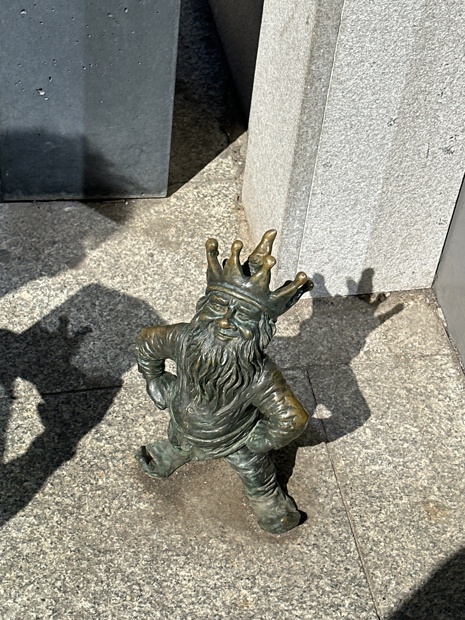 The image shows a bronze dwarf statue, a type of sculpture that is popular in the city of Wrocław, Poland. The dwarf is lying on its back on a gray, granite-like surface, likely a sidewalk or a public…read more