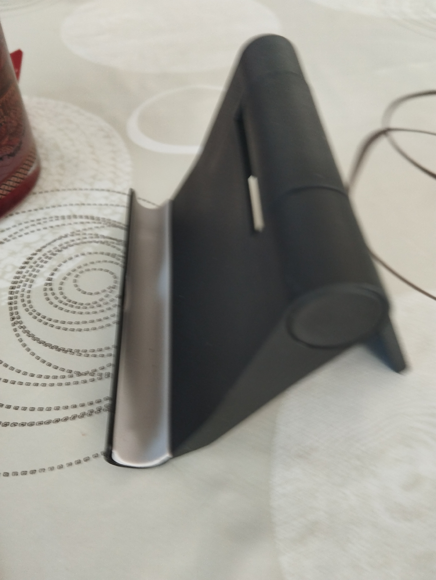 The image shows a black tablet or phone stand on a light-colored patterned surface. A red decorative object is partially visible on the left. A thin cable extends towards the right edge of the frame.…read more