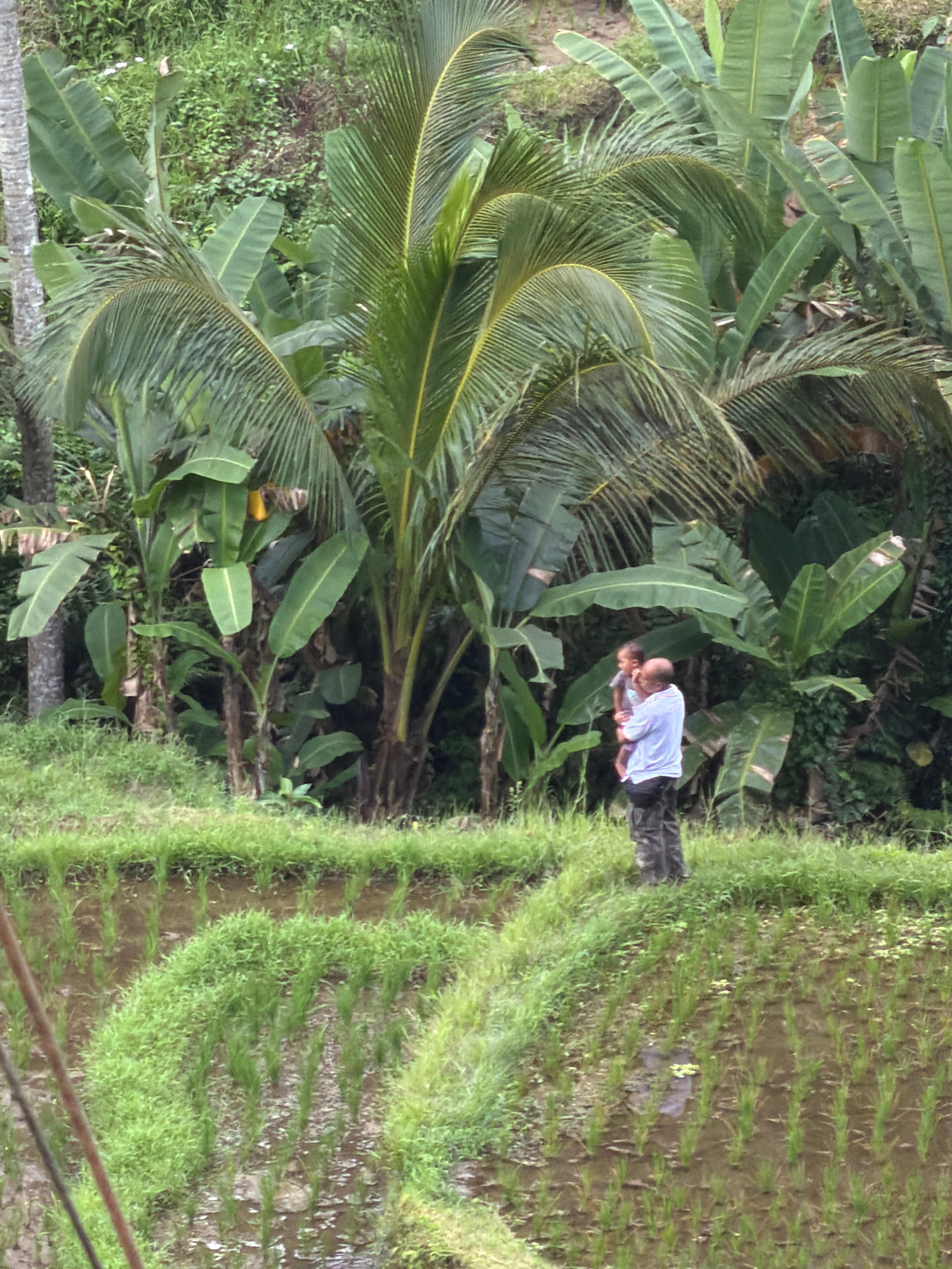 The image shows a landscape, seemingly a rice paddy or terrace, in an area with lush tropical vegetation. A man is seen holding a young child. The location is likely in Unknown, Indonesia, given the p…read more
