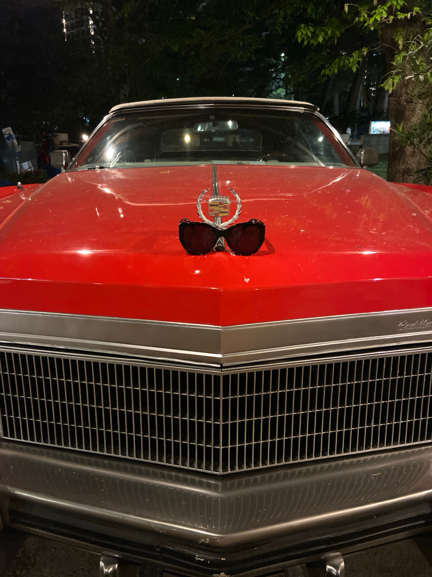The image shows the front hood and grill of a red Cadillac in a somewhat dark environment. A pair of sunglasses rests on the hood near the Cadillac emblem. The background shows foliage and indistinct…read more
