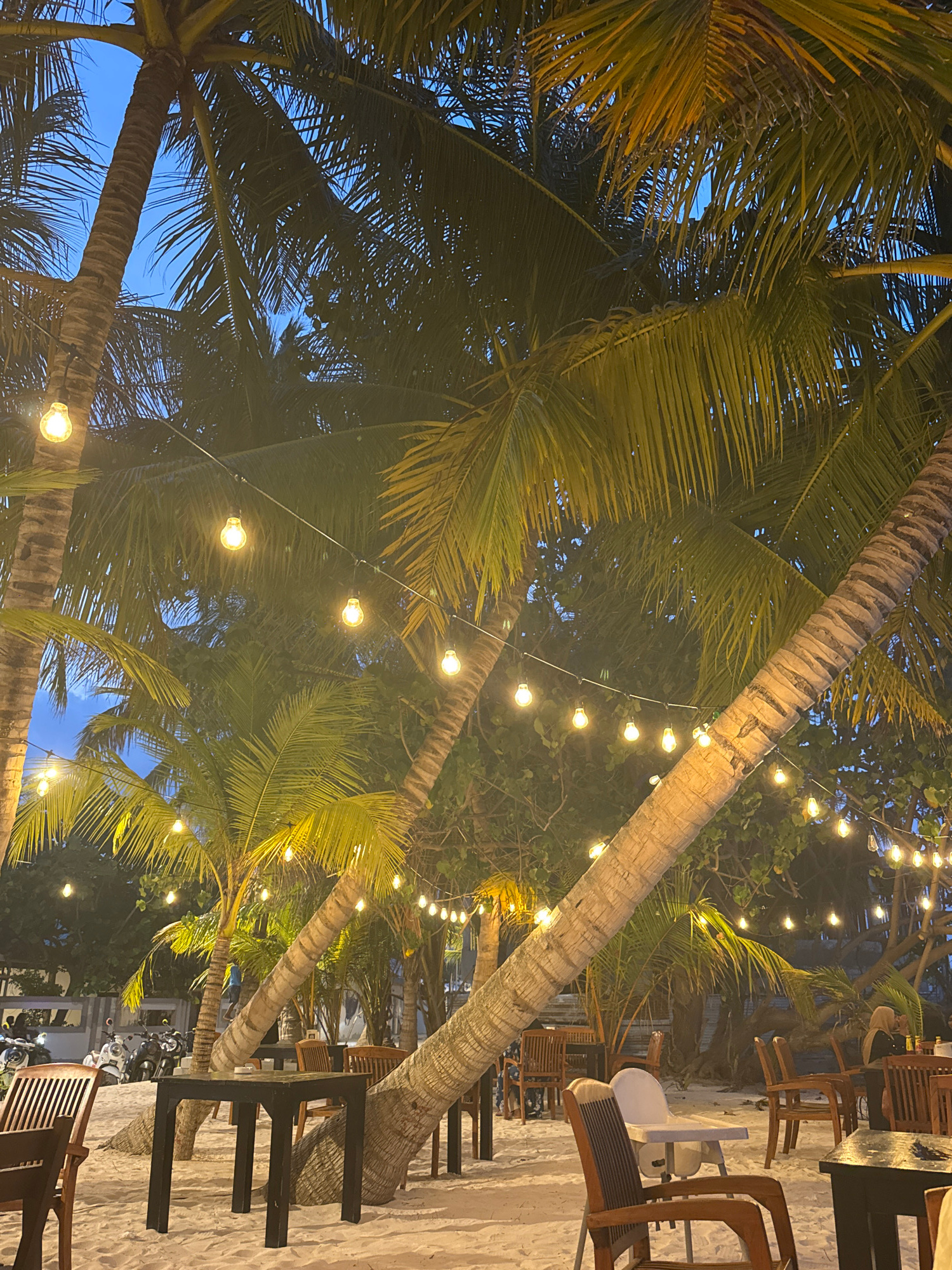 The photograph was taken in the city of Ukulhas, Maldives. The picture shows a view upwards through a canopy of palm trees, adorned with strings of incandescent light bulbs. Wooden tables and chairs a…read more
