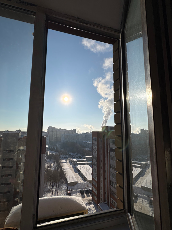 The image displays a winter urban landscape viewed from an interior window in a residential district of Kazan, Russia. The perspective is outward through an open window, with a dark window frame visib…read more