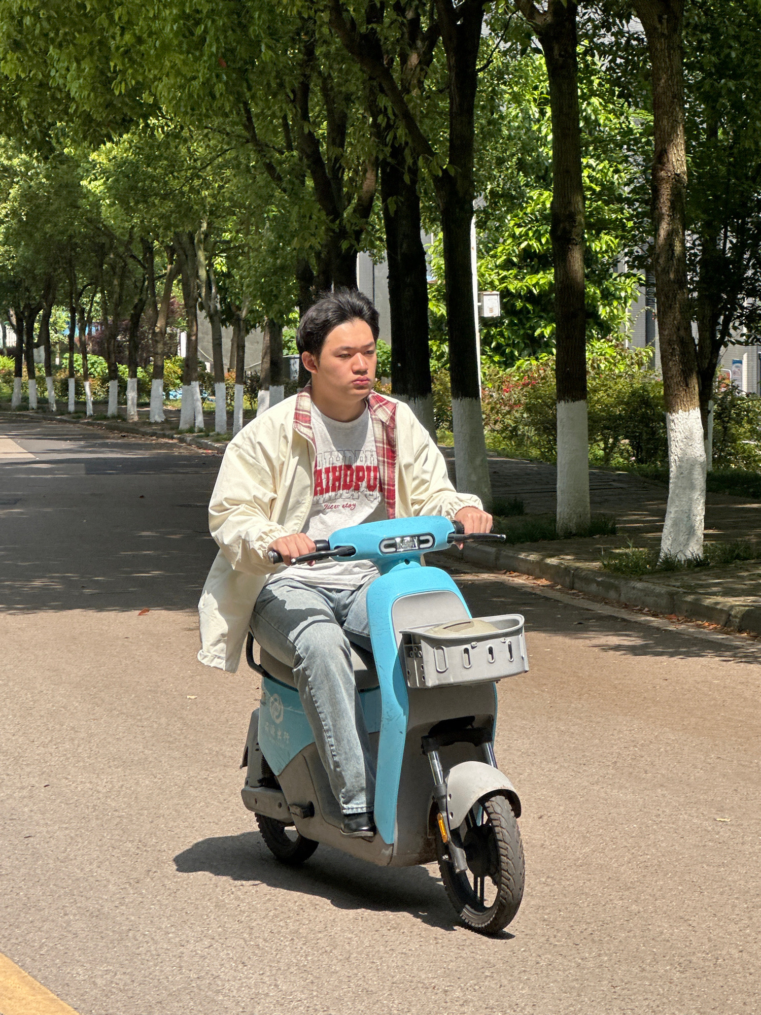 The image, correctly oriented, captures a young man seated on a light blue and grey electric shared scooter on a paved path in Jiangjin, China. The scene unfolds under bright sunlight, indicated by di…read more