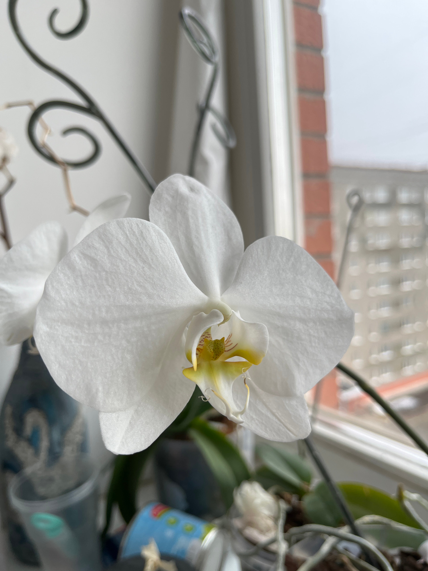 A close-up shot of a white orchid flower with a yellow center positioned in front of a window. Outside the window, brick buildings are visible. The orchid is potted in a clear container with additiona…read more