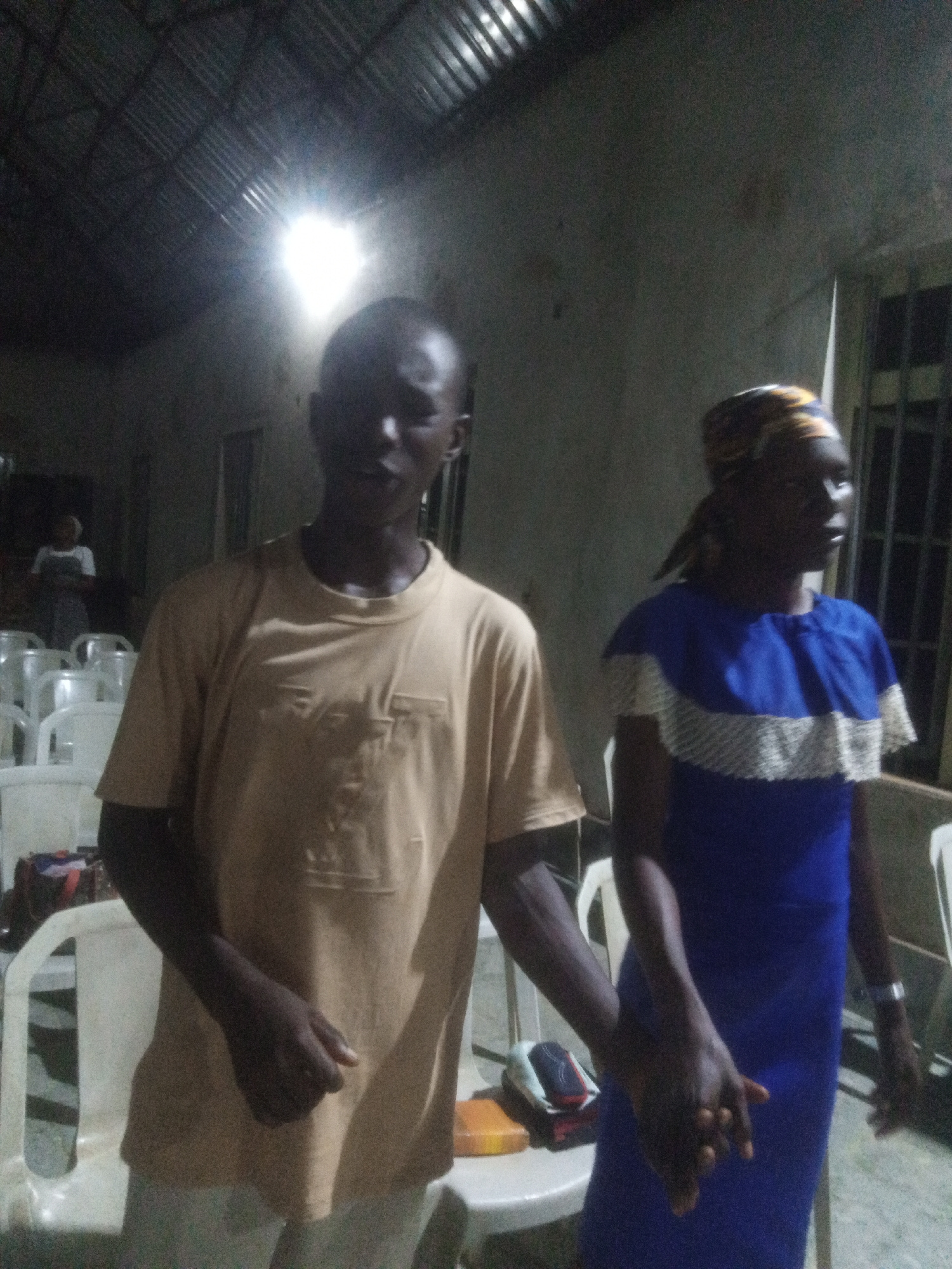 In an indoor setting in Nsugpe, Nigeria, a man and a woman are holding hands. The man is wearing a tan t-shirt and light-colored pants. The woman is wearing a blue dress with a white lace trim at the…read more