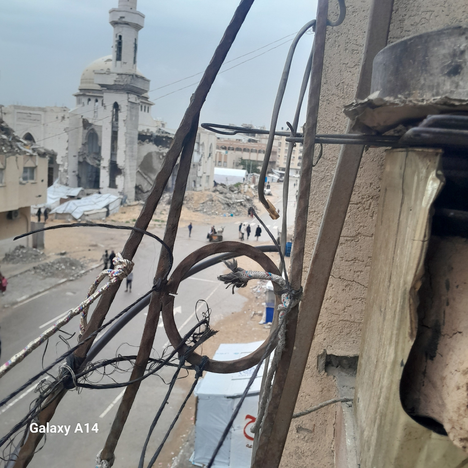 This image shows a scene of devastation, likely in Khan Yunis, Palestinian Territory. In the foreground are tangled wires and metal supports, suggesting an elevated or rooftop perspective. Looking bey…read more