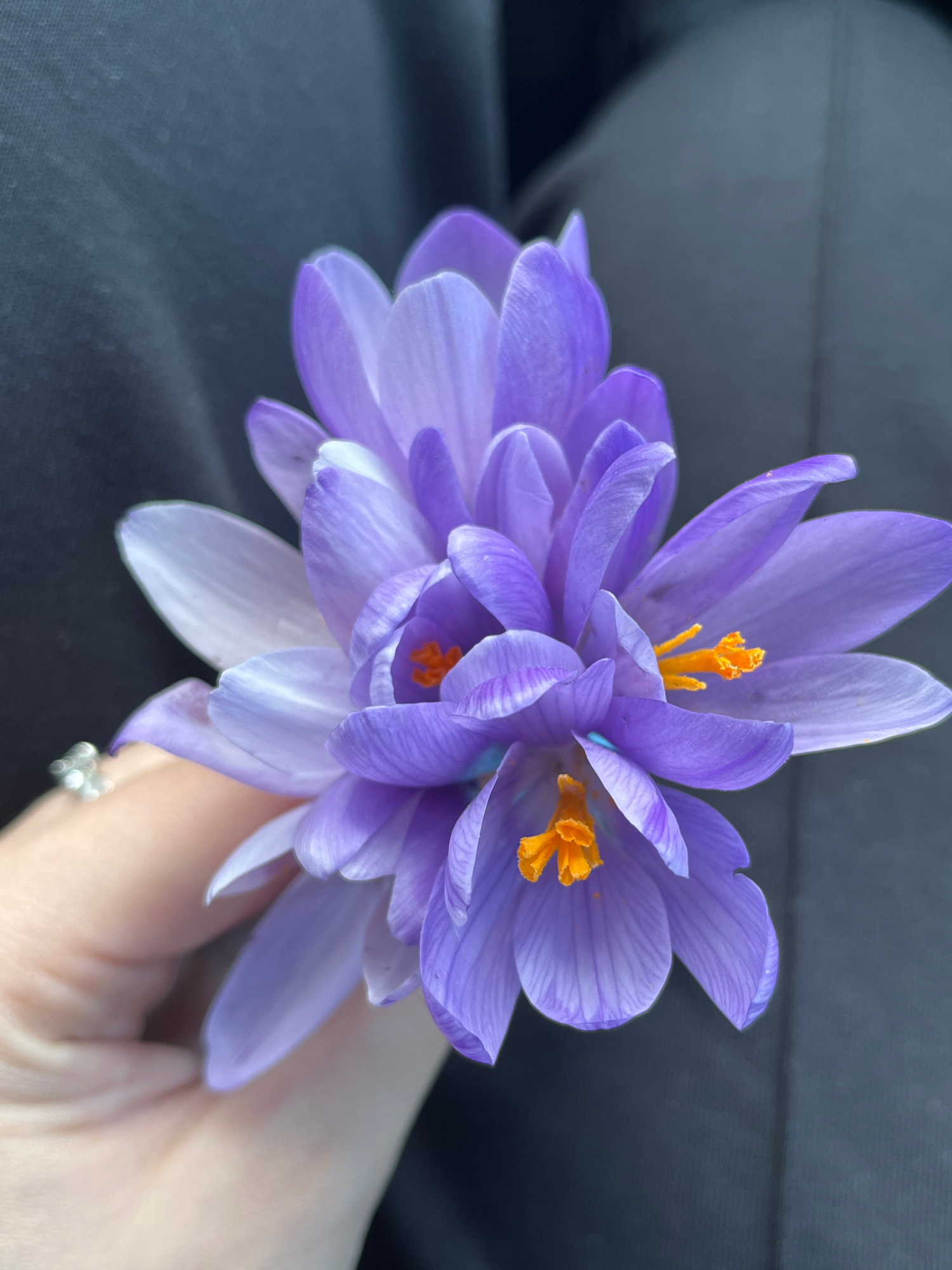 A hand holds a cluster of purple Crocus flowers with orange stamen, indoors against a dark fabric background. A silver ring is visible on the hand. The location is not discernible.
