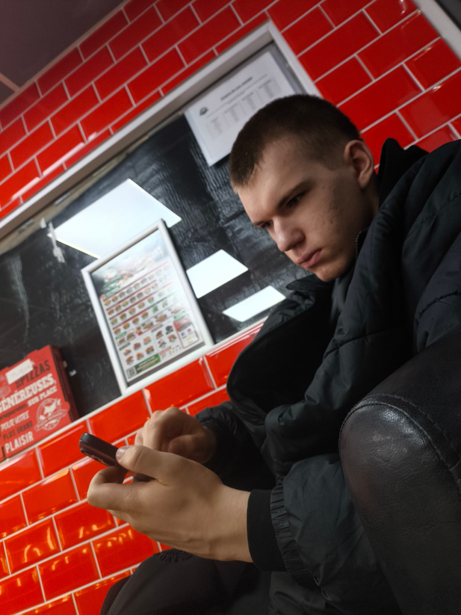The image captures a young man seated, likely in a restaurant in Strasbourg, France, based on the "PIZZAS GENEREUSES" branding visible on the wall. The walls are covered in red brick tiles. The man is…read more