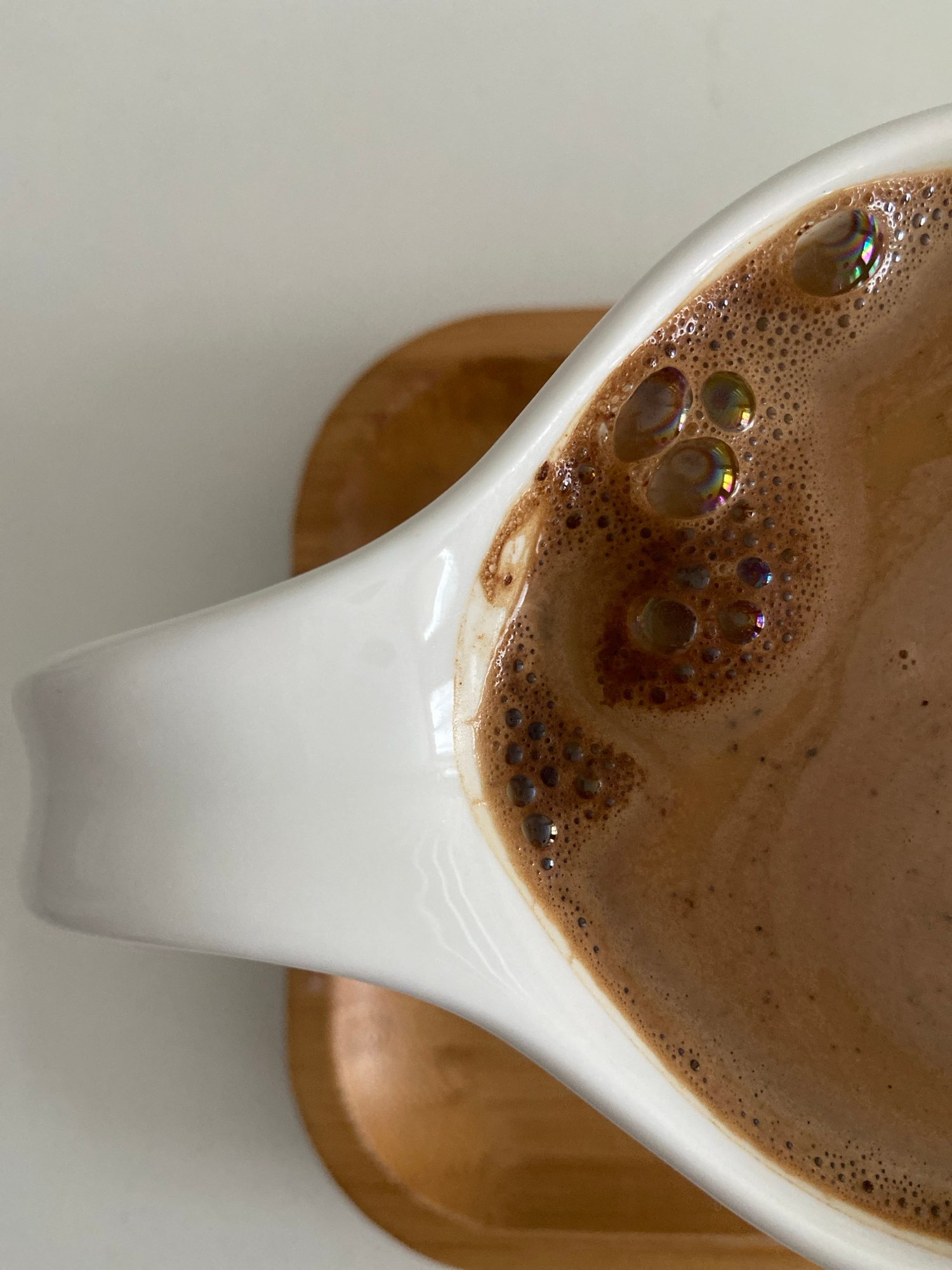 An overhead shot focuses on a cup of coffee or hot chocolate. The beverage is brownish, with numerous small bubbles and larger iridescent bubbles near the white ceramic cup's edge. The cup sits on a l…read more