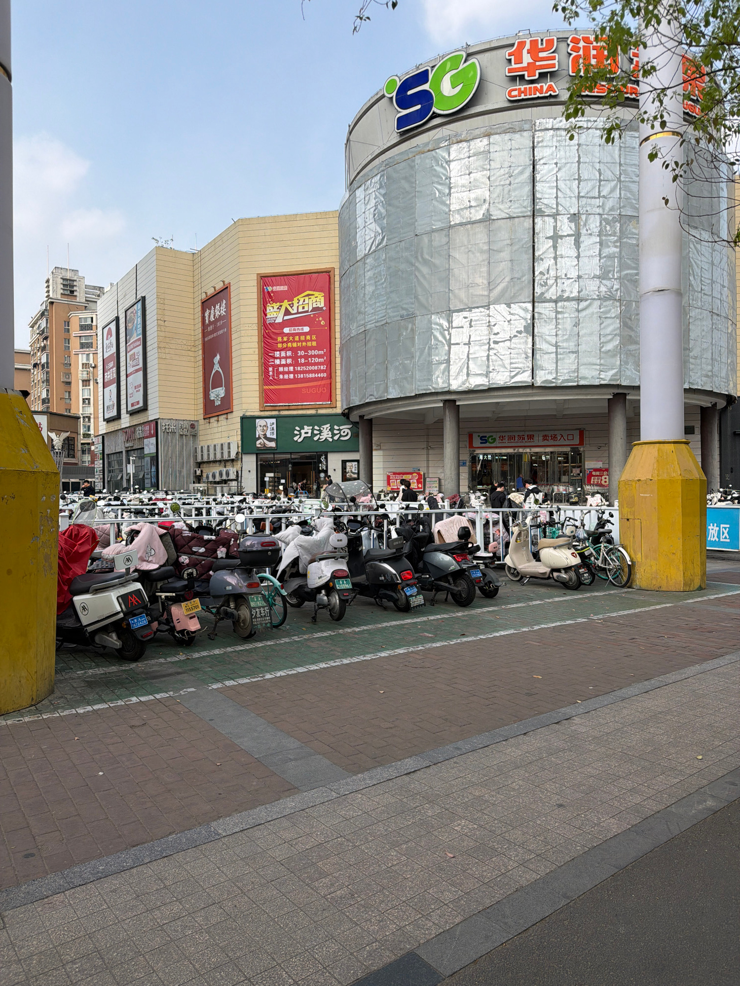 This image captures a vibrant urban scene in Jiangning District, China, on a clear, bright day. The central focus is a large commercial building, partially covered with reflective, square-patterned cl…read more