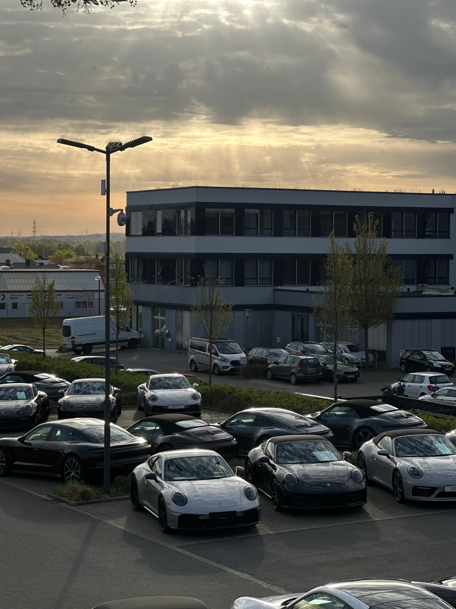 The image shows a parking lot in Holzwickede, Germany. The parking lot is adjacent to a modern building with multiple floors and windows. The sky is cloudy with a yellow glow from the sun near the horβ¦read more