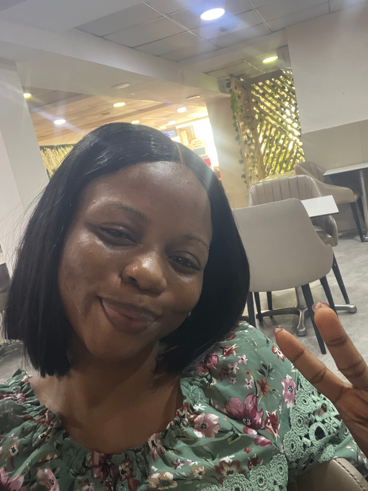 The image shows a woman with dark hair and skin, wearing a green floral-patterned top. She is indoors, likely in a commercial setting, as indicated by the modern decor and chairs in the background. Aβ¦read more