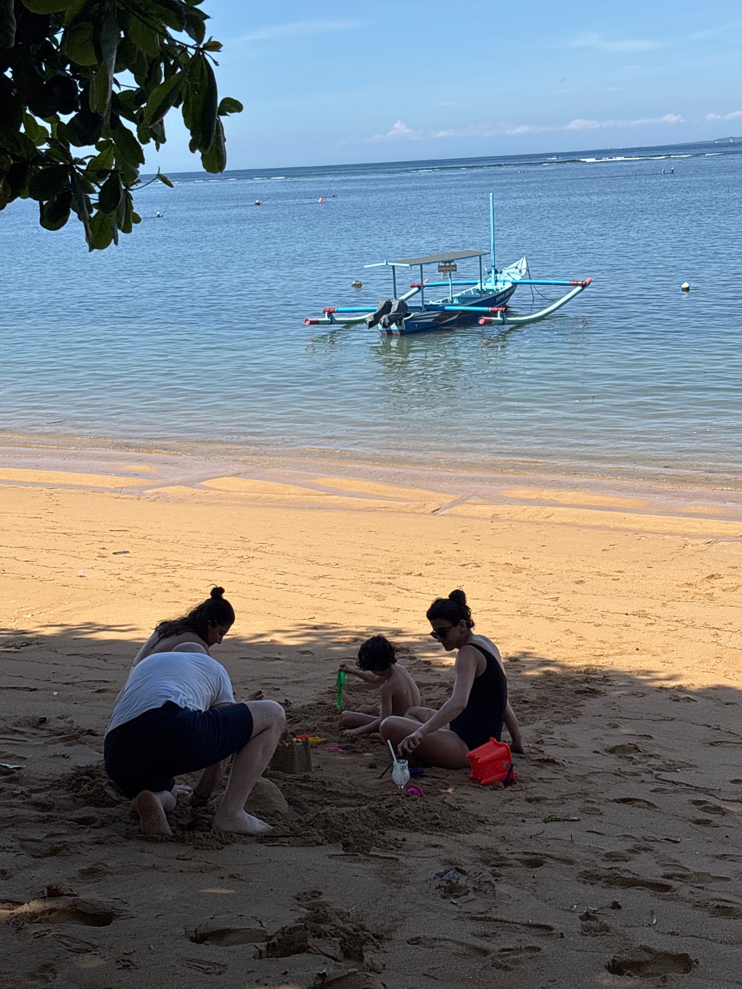 The image shows a beach scene in Denpasar, Indonesia. On the left, a calm ocean with a traditional Indonesian outrigger boat anchored near the shore. On the right, three individuals are on the beach,…read more