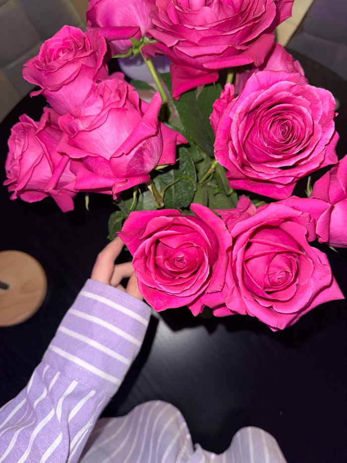 The scene depicts a close-up, top-down perspective of a bouquet of approximately ten vibrantly pink roses arranged on a dark, possibly black, tabletop. The roses exhibit varying stages of bloom, with…read more