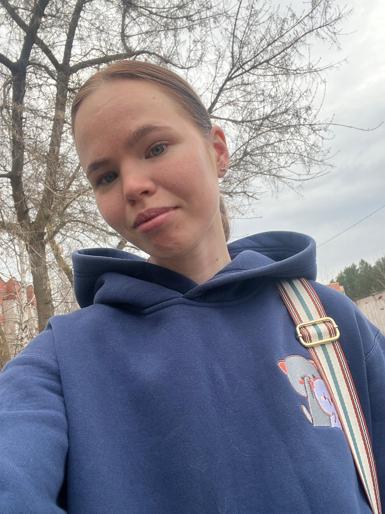 A woman with light skin and short blonde hair is taking a selfie outdoors. She is wearing a navy blue hooded sweatshirt with a small embroidered animal design on the upper right chest and a patterned…read more
