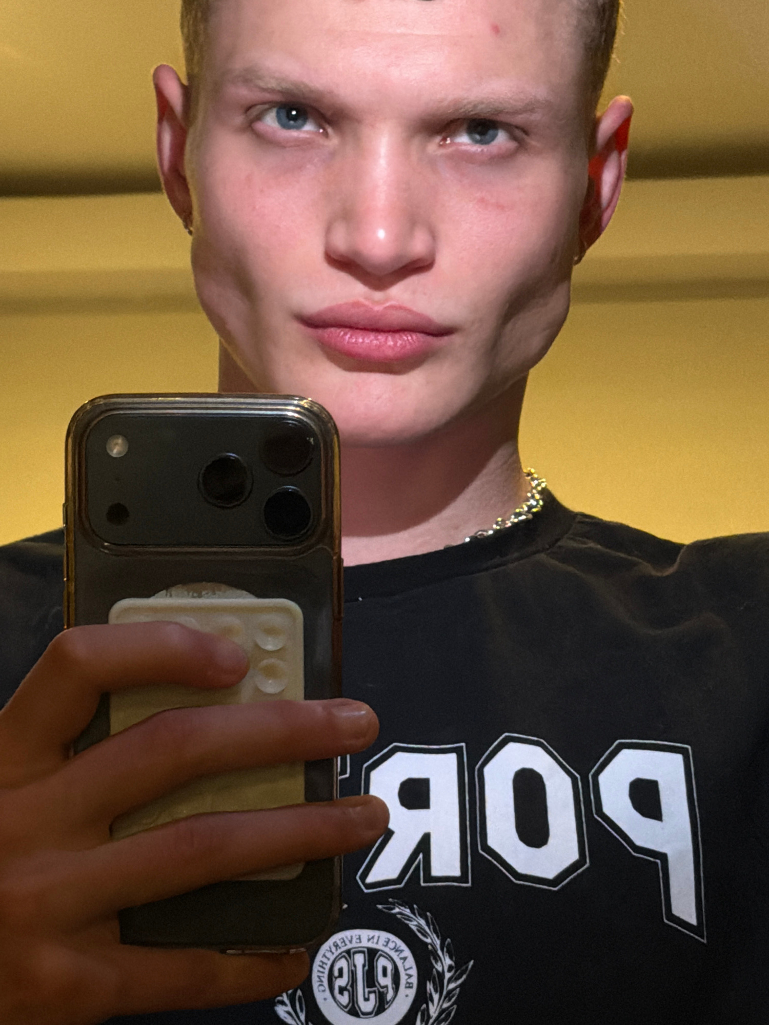 A light-skinned person with blue eyes is holding a smartphone to take a selfie. The phone has a dark-colored case and a white grip on the back. The person is wearing a black T-shirt with white letteri…read more