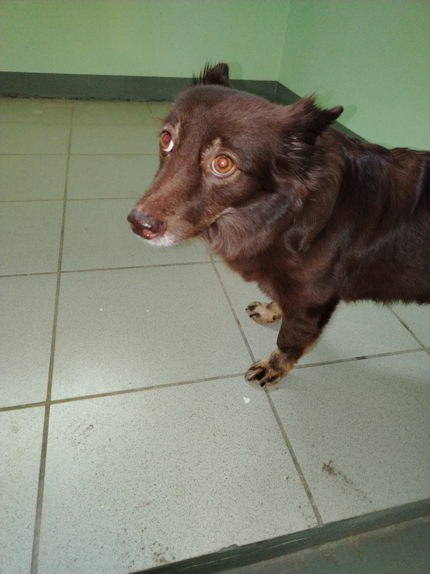 A medium-sized, dark brown dog stands indoors, looking intently towards the left of the frame. The dog has wide, prominent reddish-brown eyes that reflect the indoor lighting, giving it a somewhat staβ¦read more