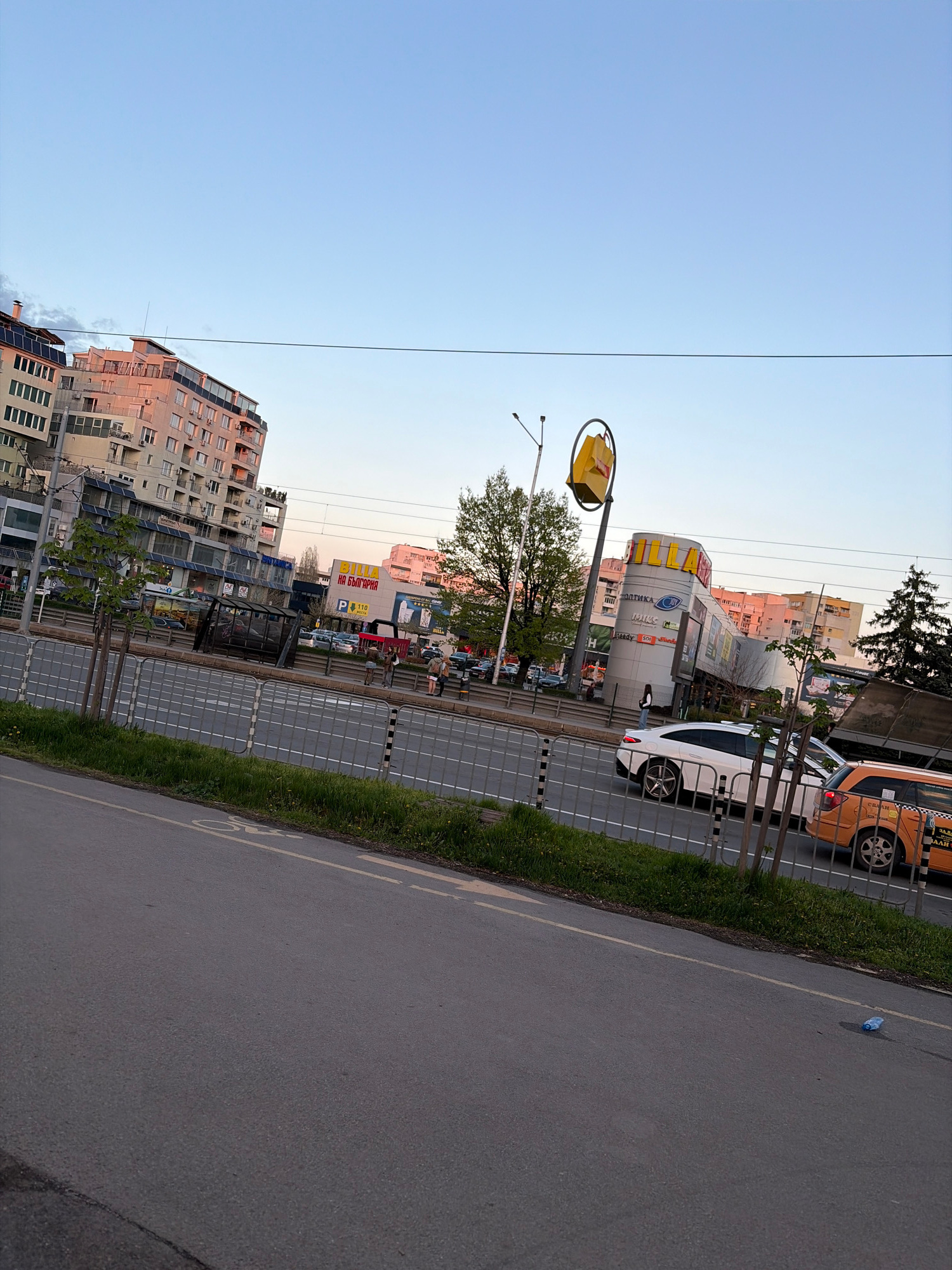 The image depicts a street scene in Sofia, Bulgaria, during daylight hours. A multi-story building is visible on the left side, with a mixture of residential and commercial spaces. The sky is clear an…read more