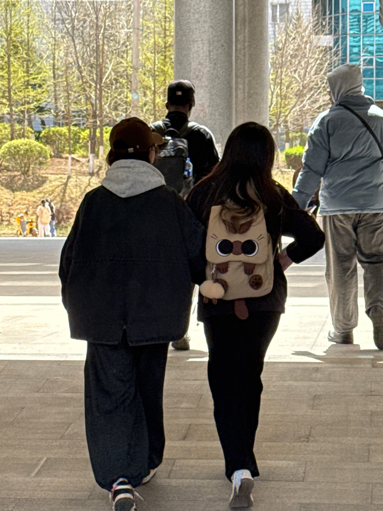 The image depicts a group of people walking outdoors on a paved surface that appears to be a sidewalk or plaza. The environment seems to be a public area with trees and potentially buildings in the ba…read more