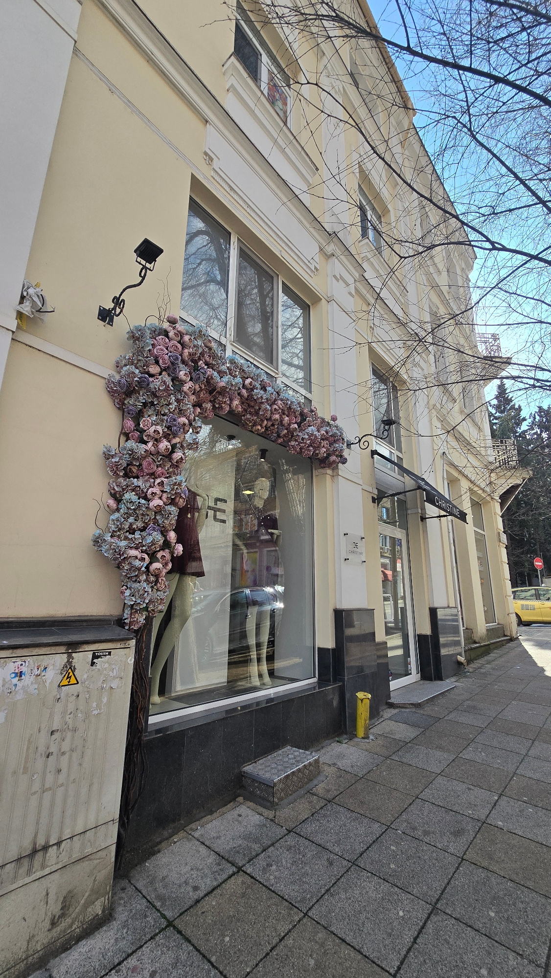 The image shows the exterior of a building in Stara Zagora, Bulgaria. The building has a light yellow facade and multiple windows. A floral arrangement of pink and blue flowers decorates the side of t…read more