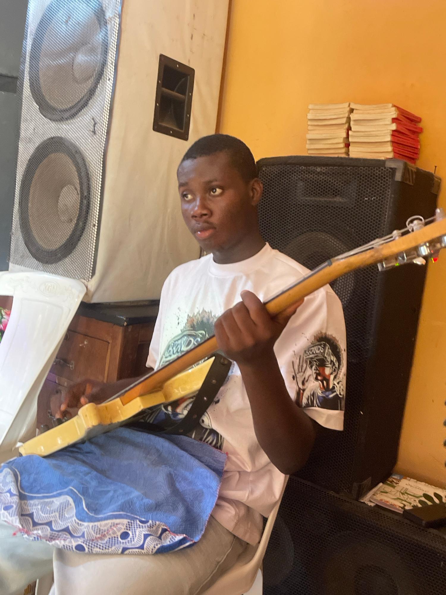A man is playing a bass guitar indoors in an environment that seems cluttered. The city and location are unknown. The man is wearing a white t-shirt with a graphic design. He is seated, holding the ne…read more