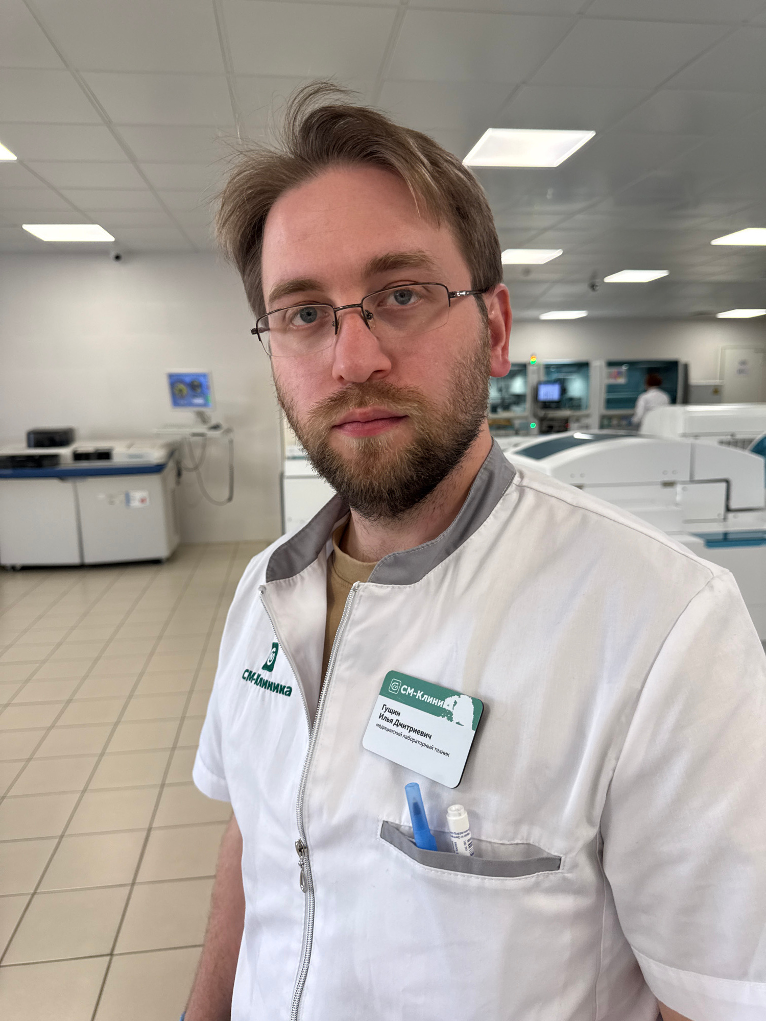 A man is centrally featured in a well-lit indoor laboratory setting in Moscow, Russia. He has short brown hair, a beard, and wears glasses, looking directly at the camera with a neutral expression. He…read more