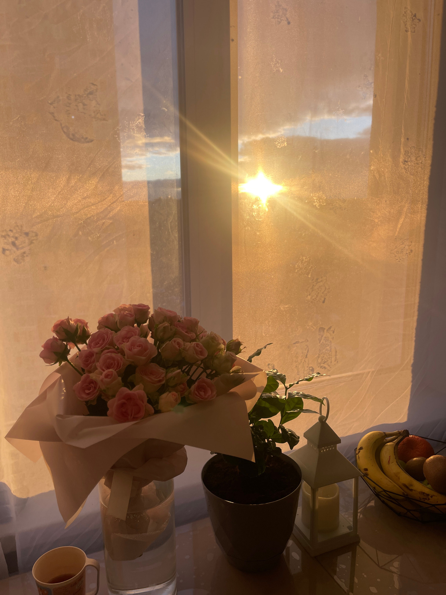 This media file captures an indoor scene in Izhevsk, Russia, at a window, illuminated by the warm, golden light of either sunrise or sunset. The strong, low-angle sun creates a bright lens flare on th…read more
